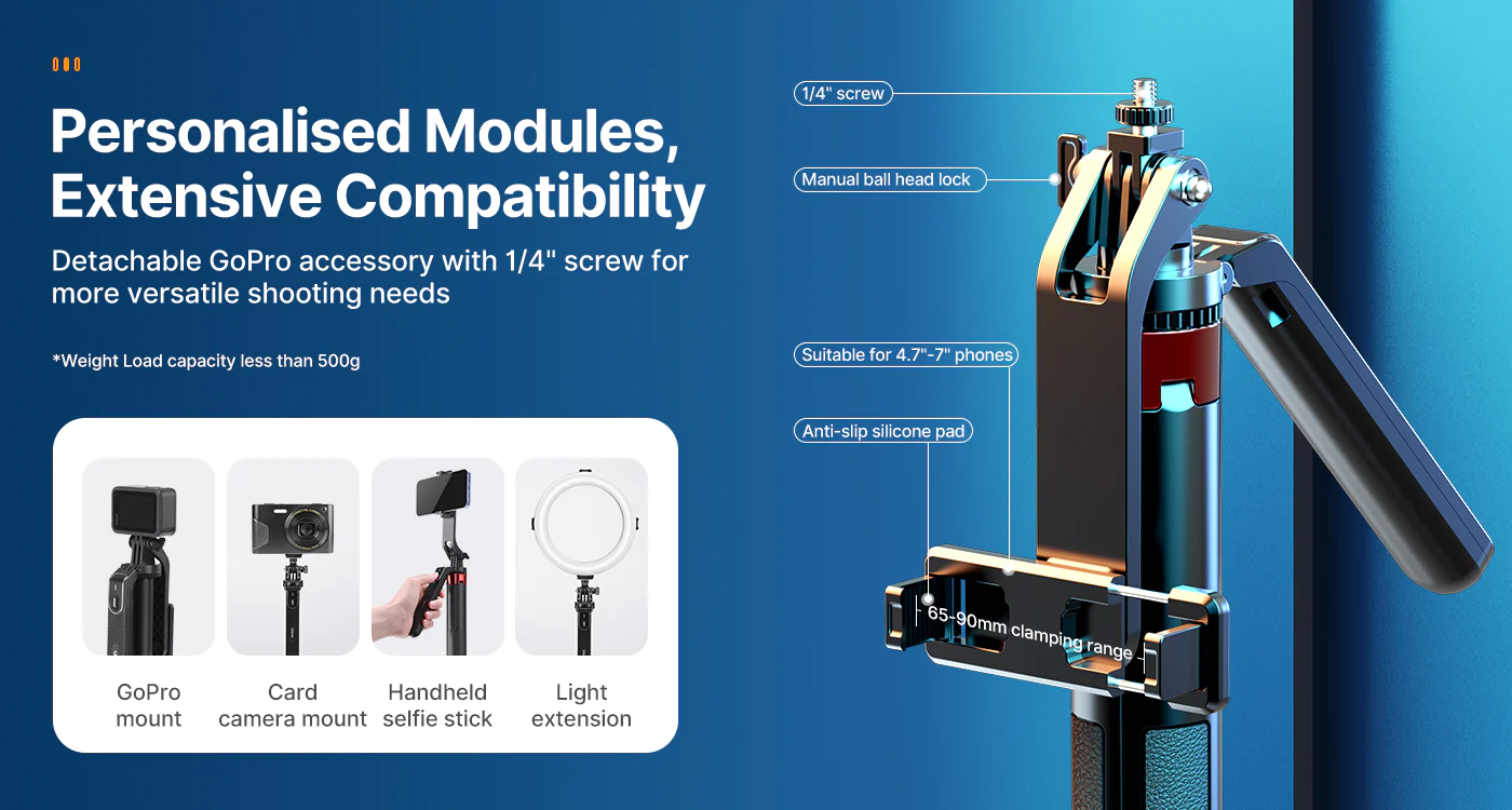 - Khả năng tương thịch rộng với ren 1/4 và kẹp điện thoại nối liền đáp ứng nhiều thiết bị như Gopro, điện thoại, máy ảnh cỡ nhỏ và đèn,...