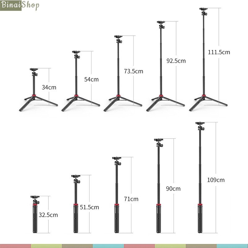 - Có thể điều chỉnh chiều dài với 4 đoạn rút, với chiều dài tối đa 109cm, chiều dài gấp gọn 32.5cm.