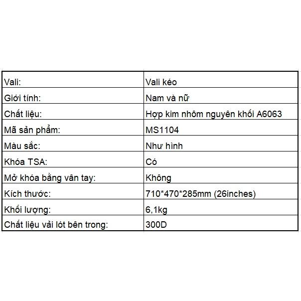 Vali hợp kim nhôm được làm từ nhôm nguyên chất kết hợp với: Silic, đồng, ạo ra sản phẩm có đặc tính vật lý trọng lượng nhẹ, độ cứng, đàn hồi, chống ăn mòn tốt.