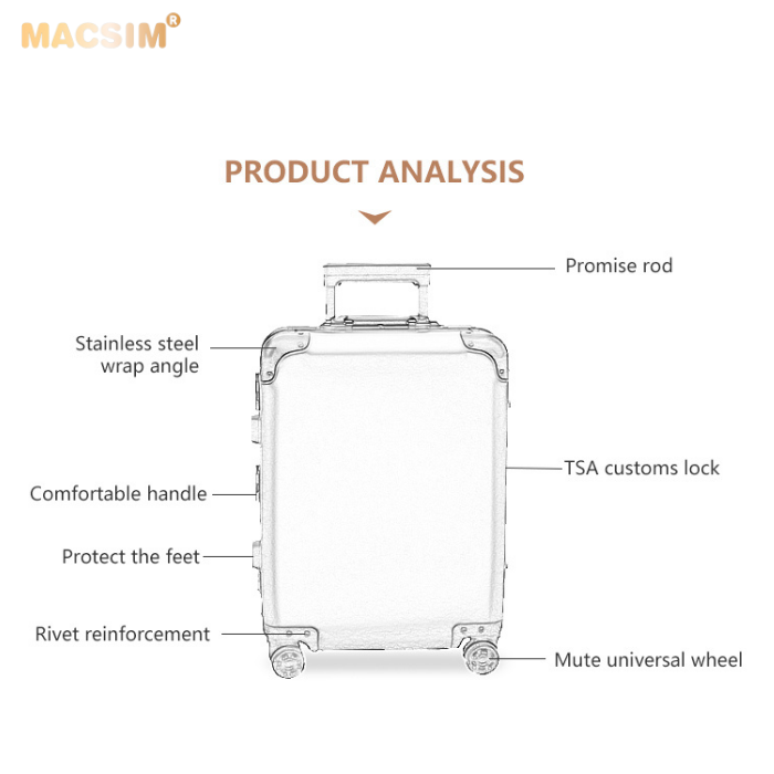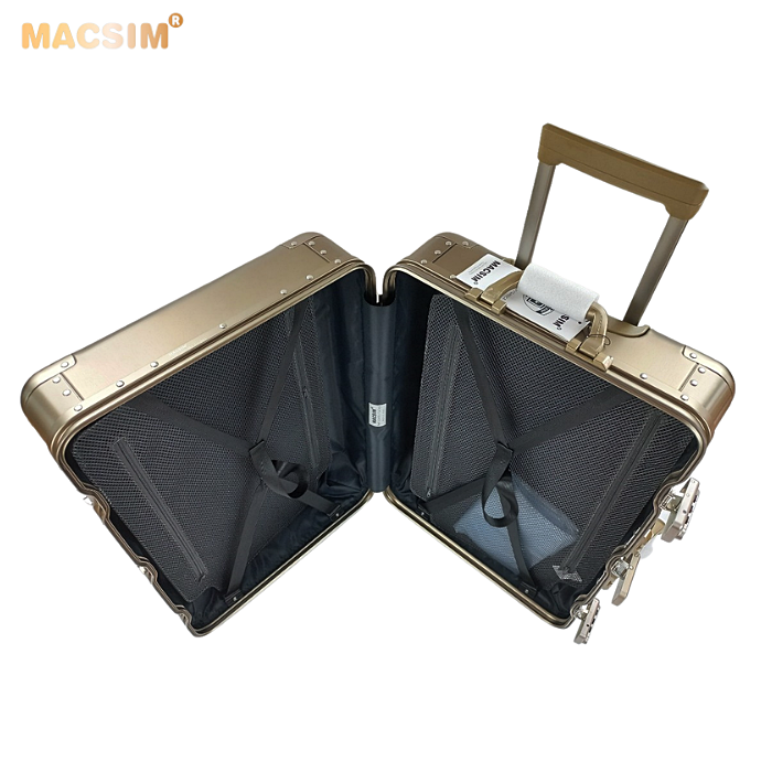 Toàn bộ thân vỏ vali Macsim làm bằng hợp kim nhôm A6063 làm cho vali rất nhẹ, độ đàn hồi cao, chống ăn mòn, chịu được tải trọng lớn.