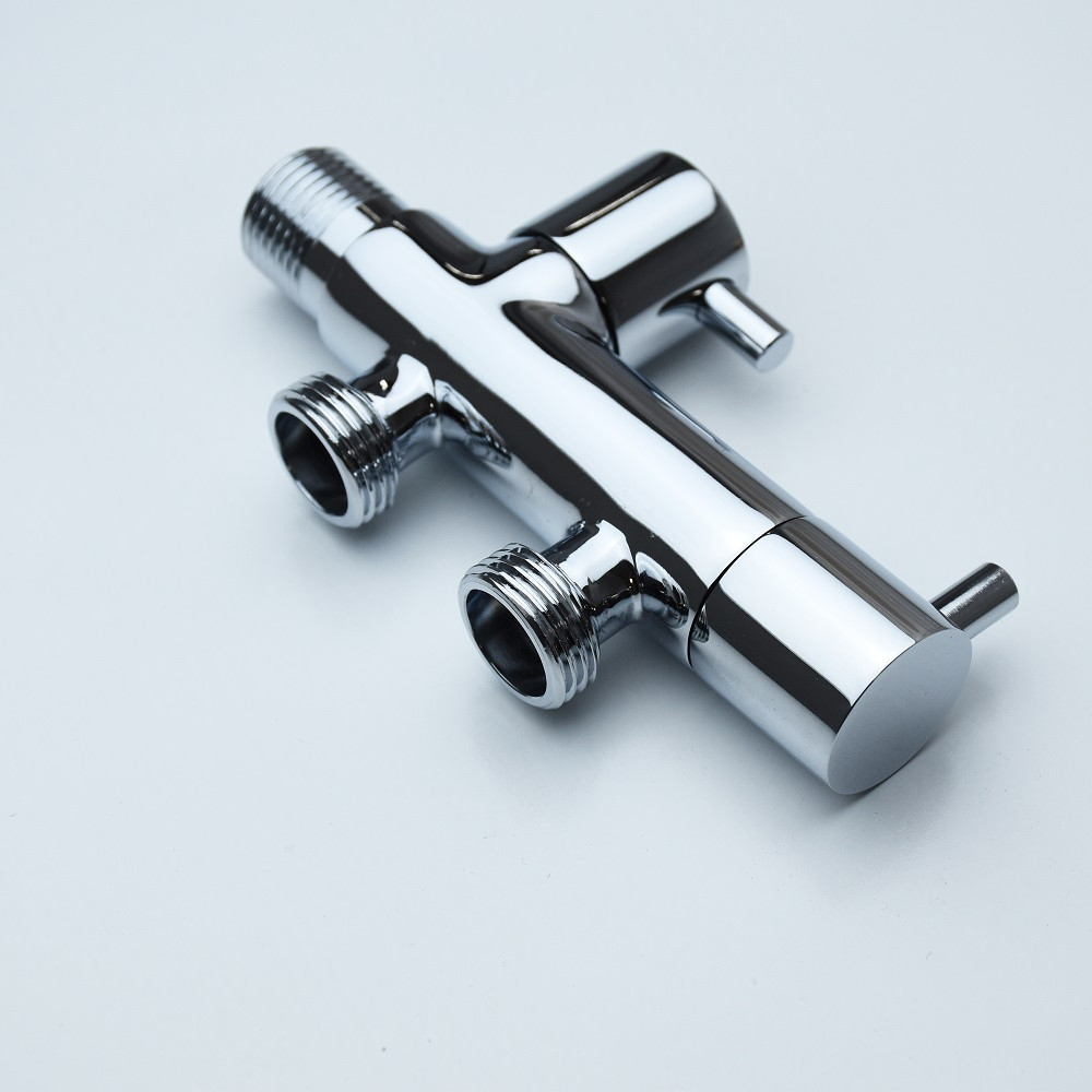 Van khóa chữ T chia hai đường nước 1 ngã cấp nước vào bồn cầu dây xịt vệ sinh, 1 ngã dùm để giảm áp lực nước Thân van được làm bằng đồng mạ chrome,