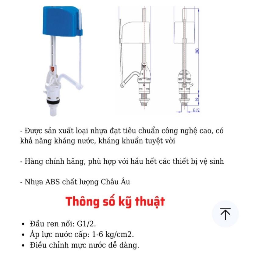 Mua tại TiktokThành phần: Nhựa ABS, POM, PP Nhiệt độ: 0 – 90 độ C Điều chỉnh mực nước dễ dàng Điều chỉnh được áp lực nước cấp Gioăng cao su chống lão hóa Van Cấp Nước Cho Bộ Xả Bồn Cầu Chất liệu nhựa ABS siêu bền, chống ăn mòn trong mọi môi trường nước Sản xuất trên dây truyền tiên tiến, bền bỉ Cách thay thế: Khóa đường nước vào, Dùng cờ lê hoặc mỏ lết tháo rời cọc cấp nước cũ đã hỏng Thay thế cọc mới vào, chú ý khi lắp cọc mới chỉ xiết vừa tay cho đủ độ khít của gioăng cao su, không xiết quá mạnh sẽ dẫn đến chờn ren hoặc vỡ ốc.
