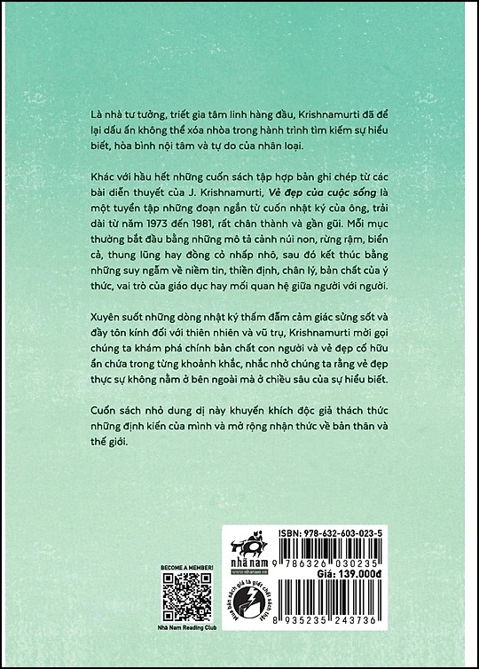 Krishnamurti, một triết gia tâm linh nổi tiếng, đã để lại một di sản sâu sắc trong hành trình tìm kiếm sự hiểu biết, hòa bình nội tâm và tự do cho nhân loại. Vẻ đẹp của cuộc sống - Nhật ký của Krishnamurti không giống như các cuốn sách khác của ông, cuốn sách này là một tuyển tập các đoạn ngắn từ nhật ký của ông trong giai đoạn từ năm 1973 đến 1981. Các mục trong sách rất chân thành và gần gũi, thường bắt đầu với những mô tả cảnh thiên nhiên như núi non, biển cả, thung lũng, và đồng cỏ, sau đó kết thúc bằng những suy ngẫm sâu sắc về niềm tin, thiền định, chân lý, bản chất của ý thức, vai trò của giáo dục và mối quan hệ giữa người với người.