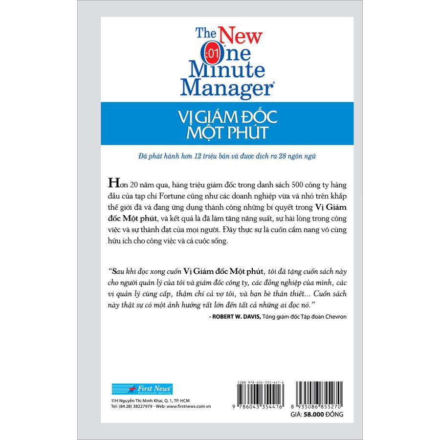 "Vị giám đốc một phút" là một câu chuyện thú vị, dễ đọc và ngắn gọn, thể hiện ba bí quyết rất thiết thực: Mục tiêu một phút, một phút khen ngợi và một phút khiển trách đã liên tục xuất hiện trong danh sách những cuốn sách bán chạy nhất trong hơn hai thập kỷ qua và trở thành một hiện tượng toàn cầu. Bất cứ ai làm công tác quản lý cũng đều biết đến cuốn sách Vị Giám đốc một phút cũng như giá trị to lớn của nó.