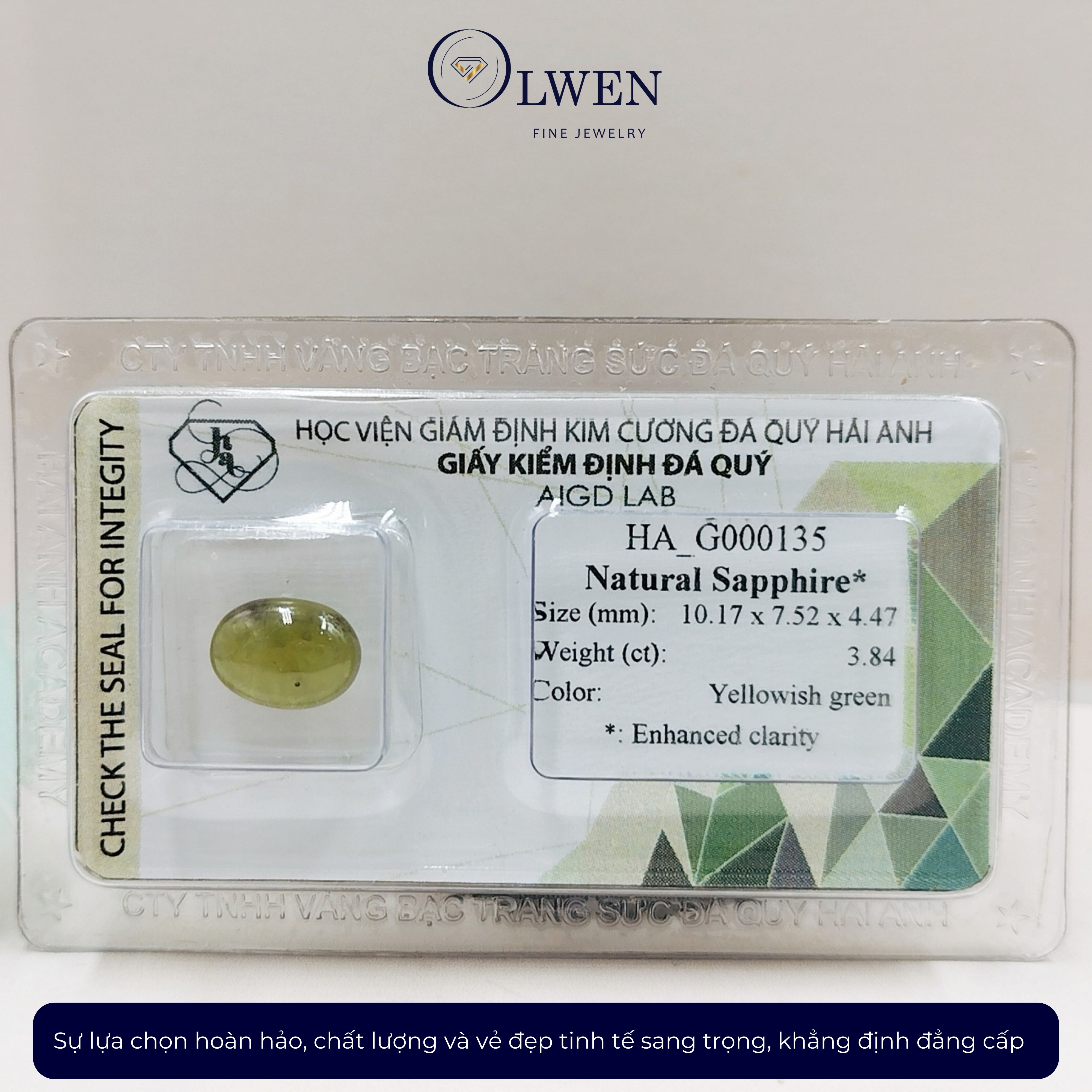 VIÊN ĐÁ SAPPHIRE THIÊN NHIÊN HA-G000135 Tên sản phẩm: Viên đá Sapphire thiên nhiên HA-G000135 , đá phong thủy. Kích thước: 7.52 - 10.17 x 4.47 mm Trọng lượng: 3.84 ct CÔNG DỤNG CỦA MẶT SAPPHIRE Giới thiệu đá Ruby – Hồng ngọc mà quên không tới người anh em Sapphire – Lam ngọc thì quả là một thiếu sót lớn. Sapphire không những nằm trong nhóm 4 loại quý nhất (kim cương, ruby, sapphire, emerald ), mà còn là một niềm tự hào của tiềm năng đá Việt Nam. Đá Sapphire được biết tới là biểu tượng của tình yêu, cho niềm vui và hạnh phúc, biểu tượng cho sự giàu có và lòng trung thực của chủ nhân. Chính vì thế loại đá này thường được xuất hiện trong những lễ cưới sang trọng, được gắn trên những cặp nhẫn đính hôn hoặc trên dây chuyền, để thể hiện lòng thuỷ chung đi đến hôn nhân của đôi bạn trẻ và bắt đầu cho một gia đình mới hạnh phúc. Đối với những người yêu cái đẹp, thích sự sang trọng và quyền quý đều luôn muốn được sở hữu đá Sapphire vì nét đẹp lung linh thuần khiết của nó. Đá Sapphire trong phong thủy