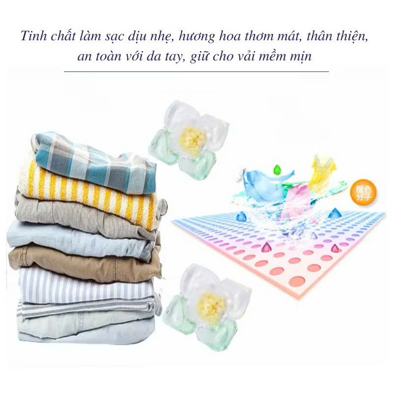 Tiện lợi và dễ sử dụng: Viên giặt được đóng gói nhỏ gọn, dễ dàng sử dụng mà không cần phải đo lường hay đổ chất giặt tẩy. Chỉ cần cho viên giặt vào máy giặt hoặc xả trực tiếp vào nước, sản phẩm sẽ tự động hòa tan và phát huy tác dụng làm sạch.