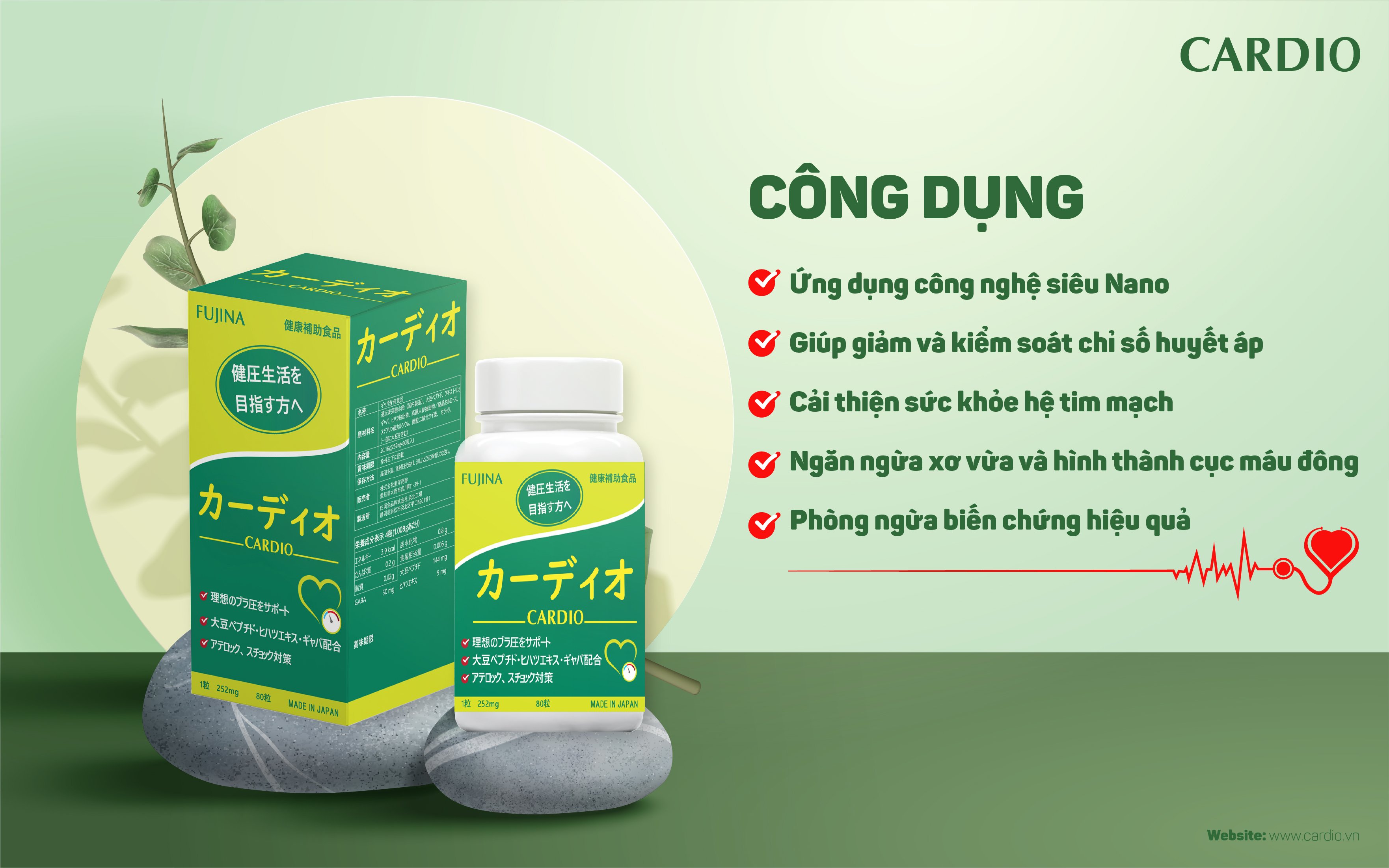 Viên hạ huyết áp Cardio Nhật Bản là sự kết hợp hoàn hảo các thảo dược tự nhiên lâu đời trong nền y học cổ truyền Nhật Bản như Tiêu lốt, Peptide đậu nành, Tinh chất nhân sâm tác dụng dược lý ưu việt, giúp làm giảm và ổn định chỉ số huyết áp một cách an toàn, hiệu quả, ngăn ngừa những biến chứng nguy hiểm, đồng thời cải thiện sức khỏe tim mạch cho người bệnh, an toàn, không gây ra bất kì tác dụng phụ nào khác. Sản phẩm được nghiên cứu và phát triển bởi tập đoàn Fujina Nhật Bản, có đầy đủ nghiên cứu lâm sàng chứng minh hiệu quả.