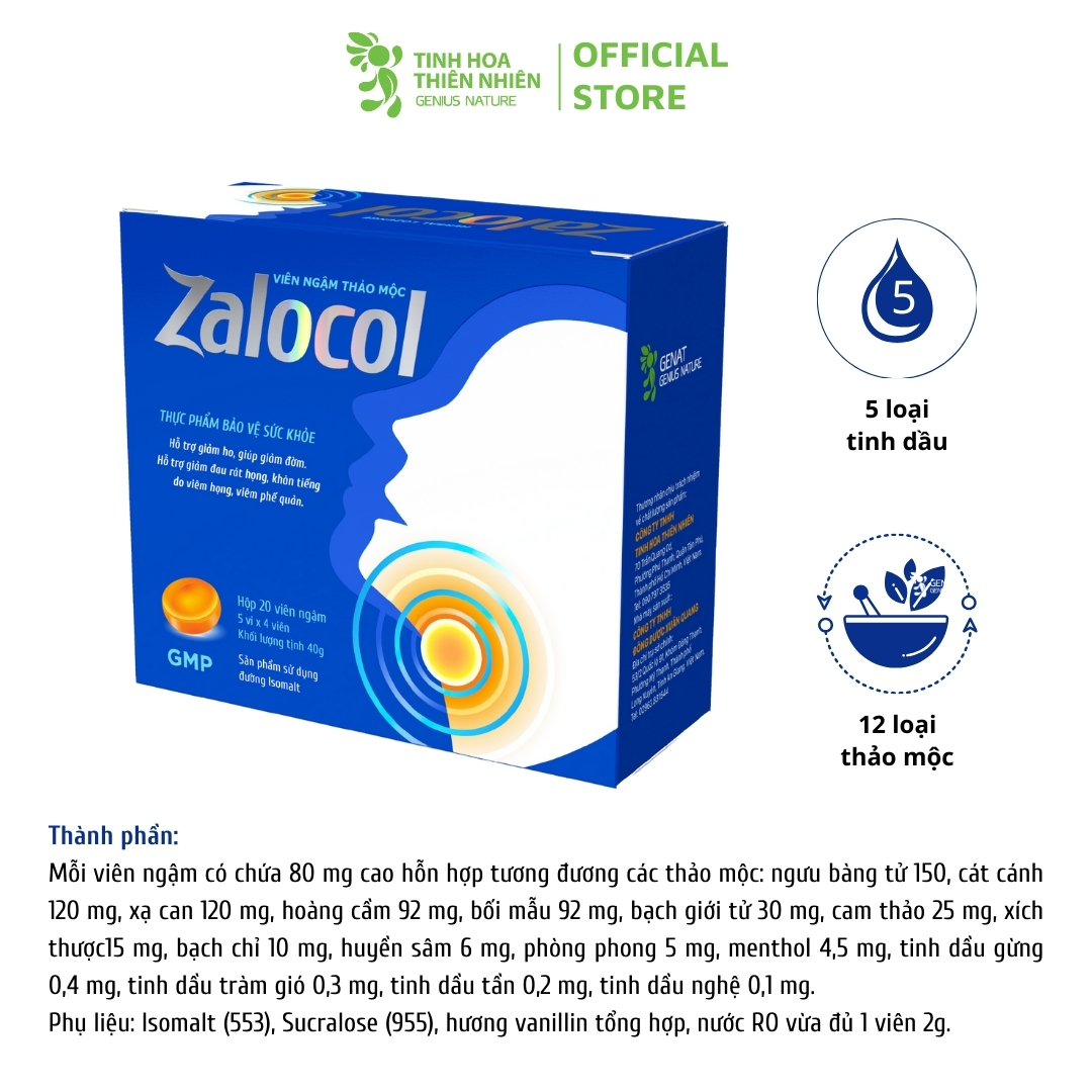 Combo 2 hộp 20 viên - TPBVSK Viên ngậm thảo mộc Zalocol Hỗ trợ giảm ho, giảm đờm, giảm đau rát họng, khản tiếng - Genat Thành phần: Mỗi viên ngậm có chứa 80 mg