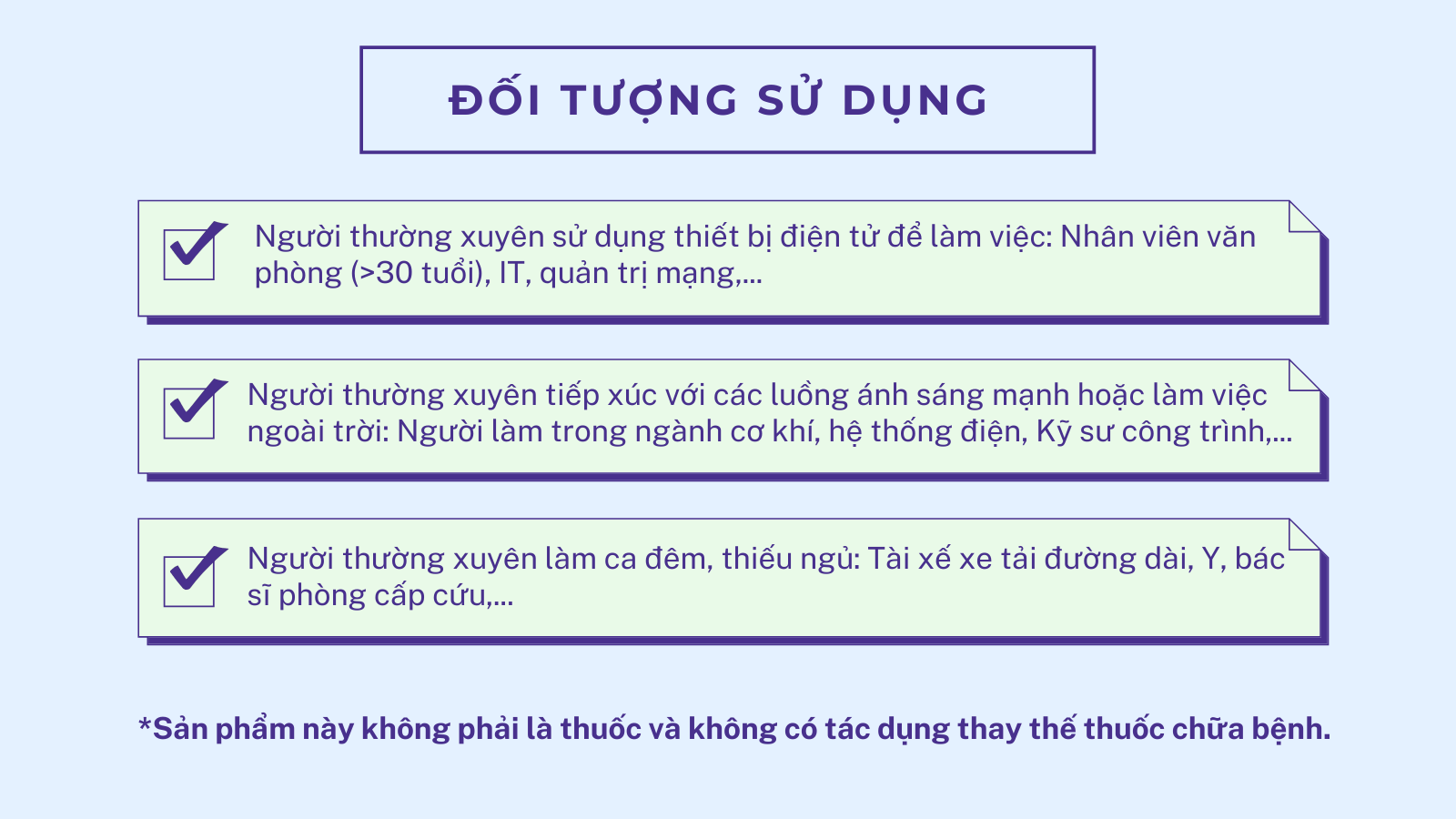 CÔNG DỤNG:  Cung cấp các chất chống ôxy hóa, làm giảm sự lão hóa của tế bào mắt, giữ ẩm cho mắt, tăng cường thị lực cường thị lực cho mắt, giúp đôi mắt sáng,