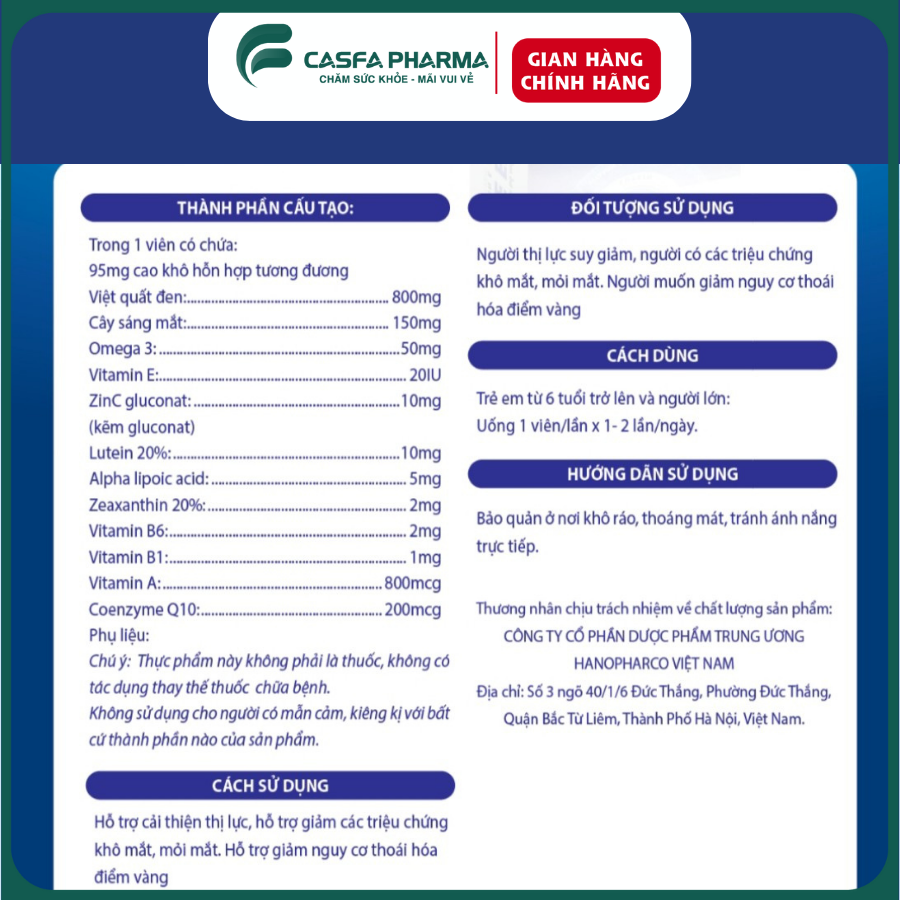 Quy cách đóng gói: Hộp - 30 viên. Nhà phân phối: CÔNG TY TNHH MEDPACK PLUS. CÔNG DỤNG Hỗ trợ cải thiện thị lực, tốt cho mắt. Đối tượng sử dụng: Người lớn.