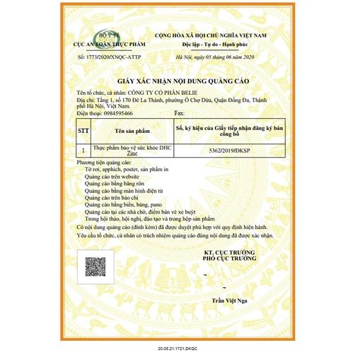 1. Tên sản phẩm: Thực phẩm bảo vệ sức khỏe DHC Zinc 2. Thành phần: Mỗi viên có chứa: kẽm gluconat: 120mg (tương đương 15mg kẽm); chiết xuất nấm men (0,2% crôm): 30mg; chiết xuất nấm