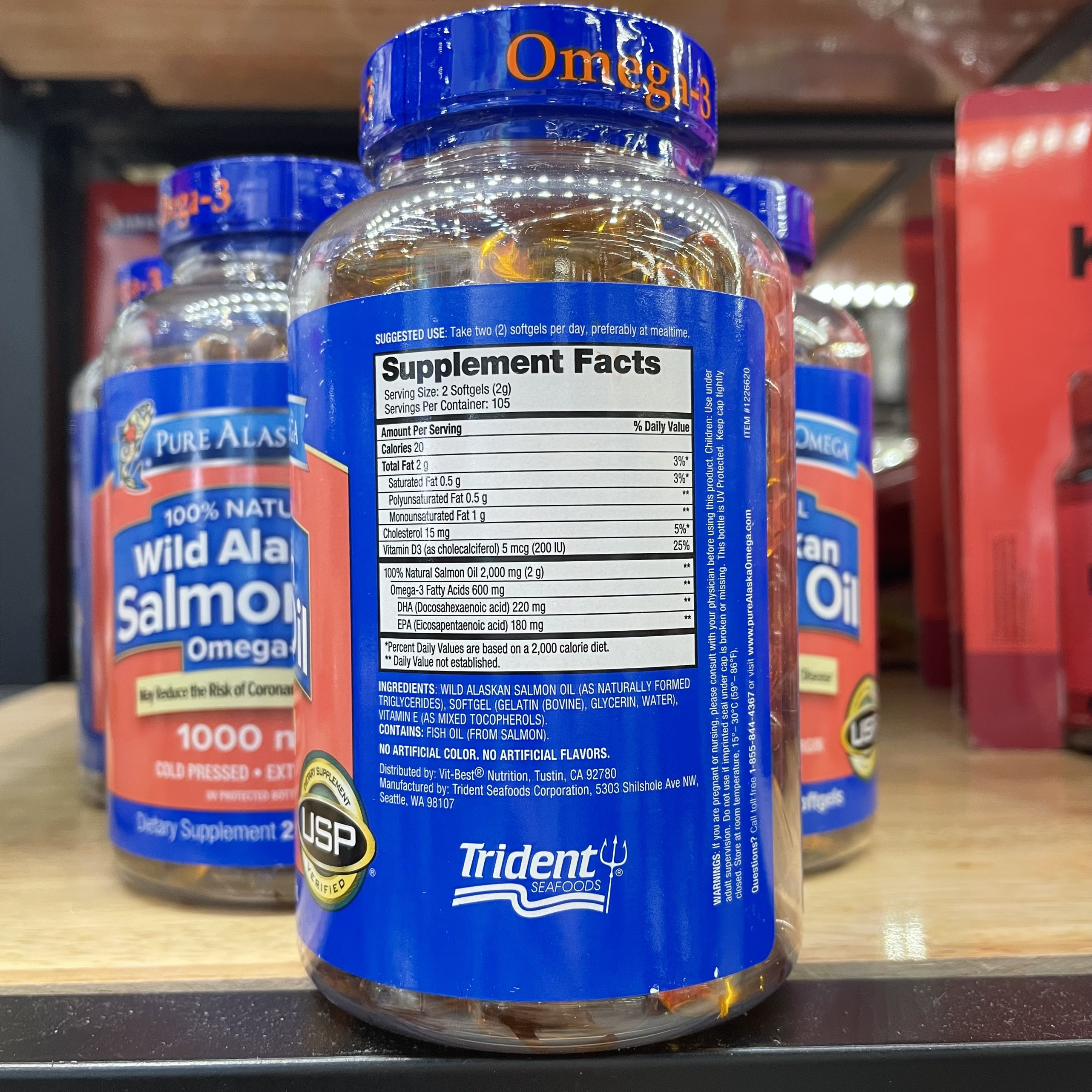 Viên dầu cá hồi Pure Alaska Omega 3 Wild Salmon Oil 1000mg 180 viên của Mỹ chứa hàm lượng omega-3 rất lớn và đặc biệt rất tinh khiết,giúp giảm thiểu các vấn đề liên quan đến xương khớp, Mắt, tim mạch, hệ miễn dịch