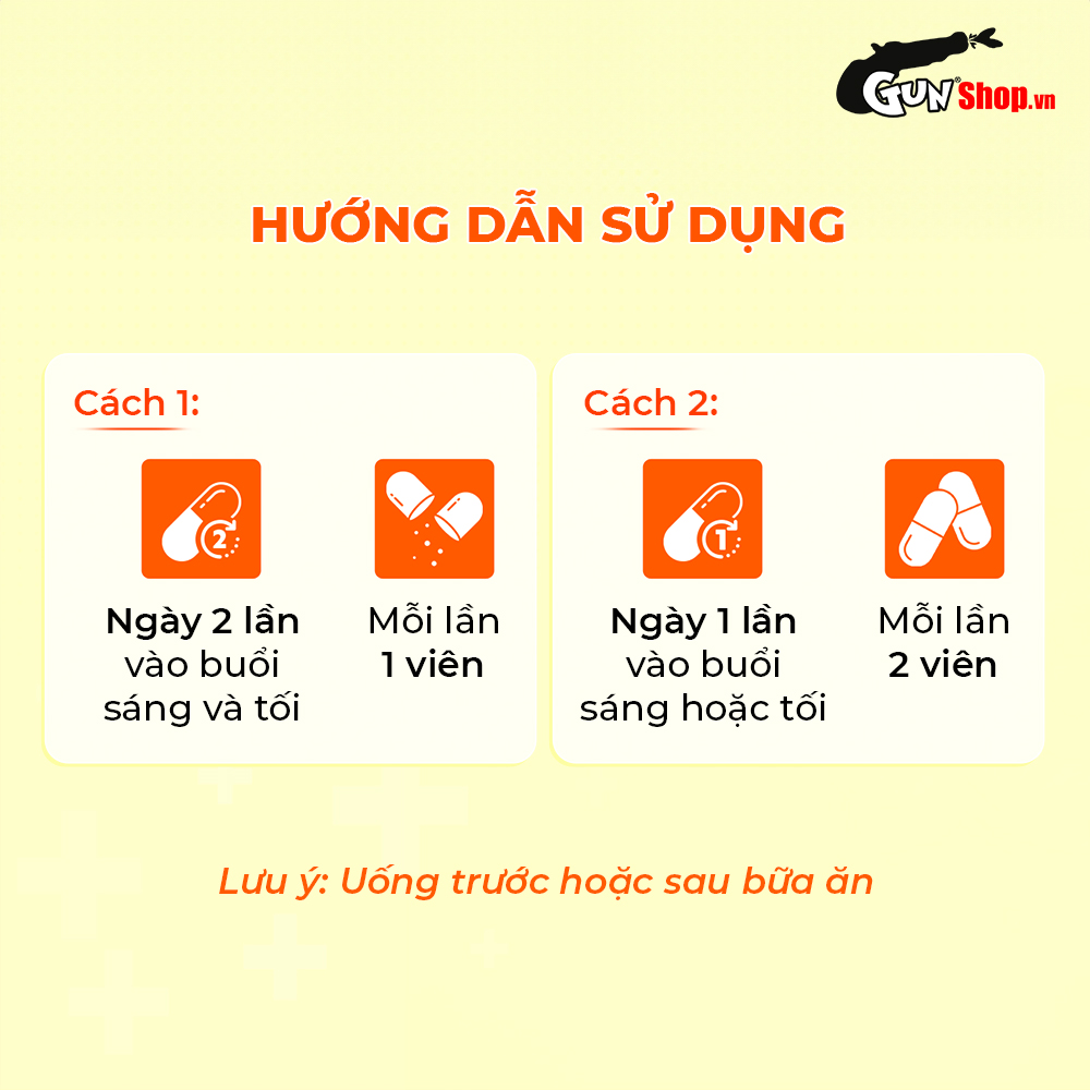 Cách dùng: Cách 1: Uống 2 viên/ngày, 1 viên buổi sáng và 1 viên buổi tối. Dùng trước hoặc sau bữa ăn. Cách 2: Uống 2 viên/ ngày, 2 viên/ 1 lần vào buổi sáng hoặc tối. Dùng trước hoặc sau bữa ăn.