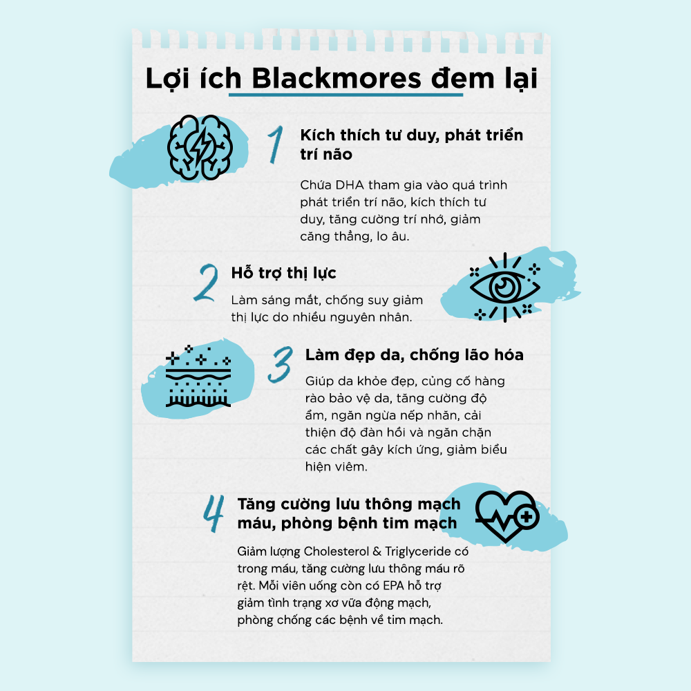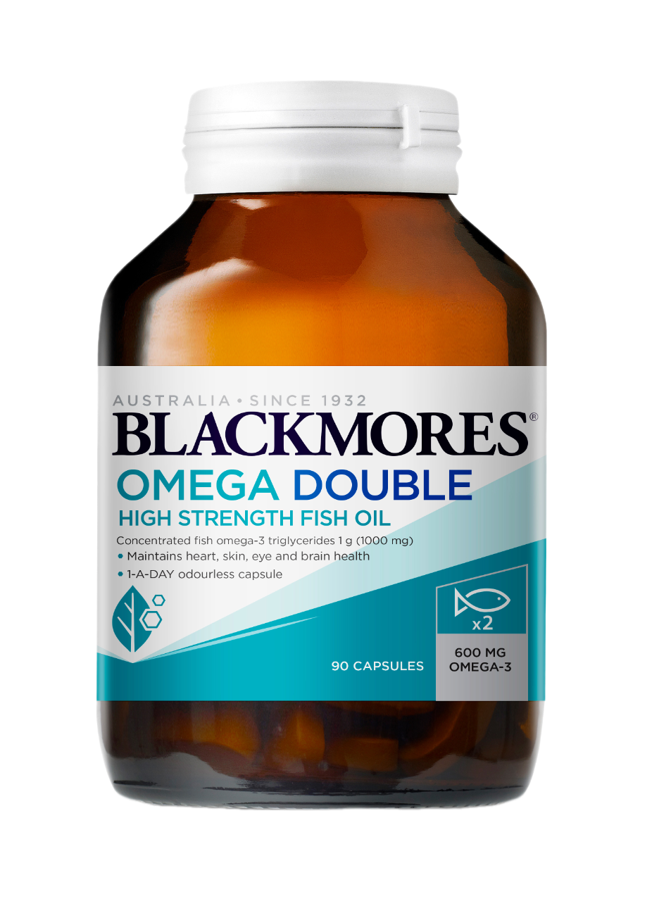 Viên uống Blackmores Omega Double High Strength Fish Oil Thành phần: Omega-3: 600mg tương đương: Eicosapentaenoic acid (EPA): 360mg, Docosahexaenoic acid (DHA): 240mg Công dụng: + Hỗ trợ quá trình lão hoá của não