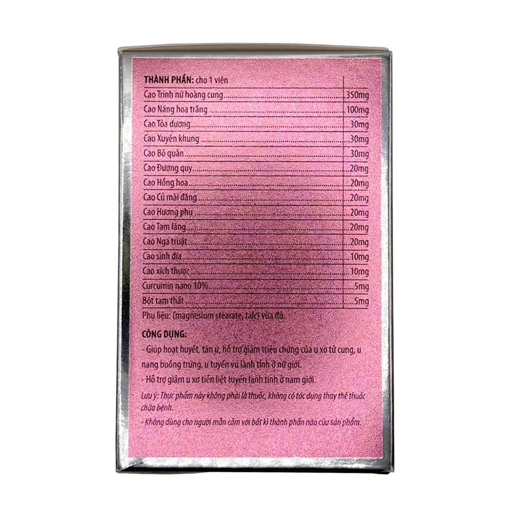 CÔNG DỤNG: Hỗ trợ hoạt huyết, chống oxy hóa, trung hòa các gốc tự do, hỗ trợ giảm các triệu chứng của: u xơ tử cung, u nang buồng trứng, u xơ tuyến vú đối