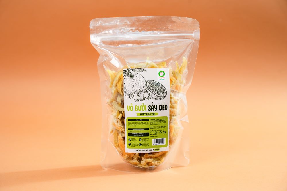 Mua tại TiktokVỎ BƯỞI SẤY DẺO Mứt Thuần Việt THÀNH PHẦN : Vỏ Bưởi (70%), đường tinh luyện, muối i-ốt, chất bảo quản (E202), chất chống oxy hóa (E223), chất điều chỉnh độ acid: Acid Tartaric (E334) SẢN XUẤT THEO: 02/HKDCSBMTL1/2021 THỜI HẠN SỬ DỤNG : 06 Tháng kể từ ngày sản xuất CHỈ TIÊU CHẤT LƯỢNG : ĐỘ ẨM ≤ 35% HƯỚNG DẪN SỬ DỤNG VÀ BẢO QUẢN: HƯỚNG DẪN BẢO QUẢN: BẢO QUẢN NƠI KHÔ RÁO, THOÁNG MÁT. TRÁNH ÁNH NẮNG TRỰC TIẾP. NHIỆT ĐỘ THÍCH HỢP: 220C-300C HƯỚNG DẪN SỬ DỤNG: DÙNG NGAY SAU KHI MỞ BAO BÌ. THÔNG TIN CẢNH BÁO: KHÔNG SỬ DỤNG SẢN PHẨM KHI ĐÃ HẾT HẠN SỬ DỤNG GIẤY CHỨNG NHẬN HACCP SỐ 21.4256 – HACCP/VC DO TRUNG TÂM GIÁM ĐỊNH VÀ CHỨNG NHẬN HỢP CHUẨN HỢP QUY VIETCERT ĐÁNH GIÁ CHỨNG NHẬN PHÙ HỢP TIÊU CHUẨN. BAO BÌ THAY ĐỔI THEO TỪNG LÔ HÀNG.