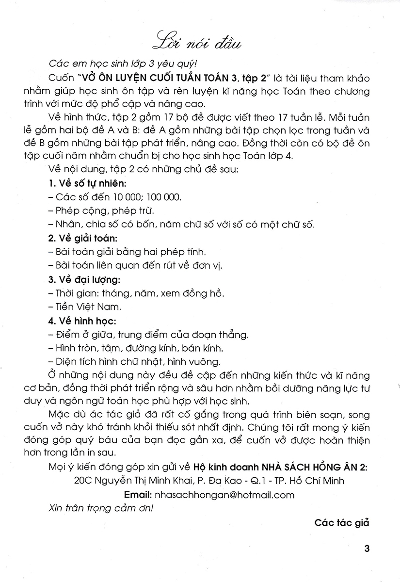 Cuốn "VỞ ÔN LUYỆN CUỐI TUẦN TOÁN 3, tập 2" là tài liệu tham khảo nhằm giúp học sinh ôn tập và rèn luyện kĩ năng học Toán theo chương trình với mức độ phổ cập và nâng cao. Về hình thức, tập 2 gồm 17 bộ đề được viết theo 17 tuần lễ. Mỗi tuần