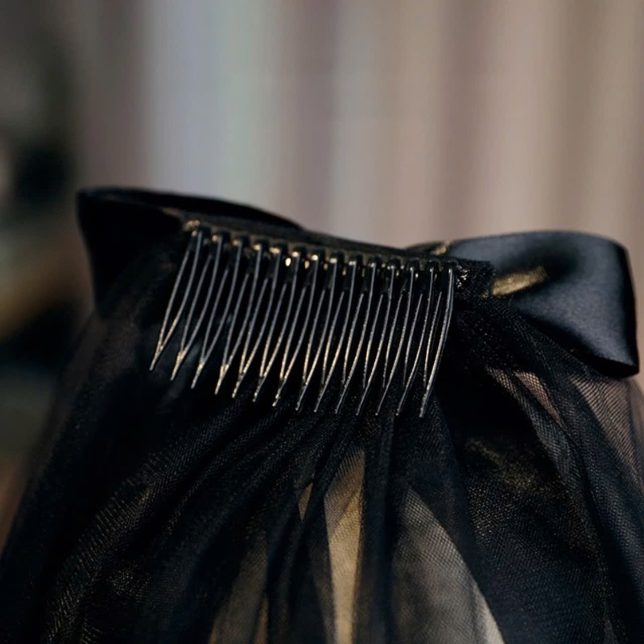 Voan (lúp) Cô dâu và Dạ hội, đi tiệc, sự kiện MS: 45533 Chất liệu: ren voan trong, đính nơ ruy băng. Kiểu dáng: xếp 2 tầng, có lược cài, đính nơ ruy băng Kích thước: ~ 60*80 cm. Màu sắc: đen.