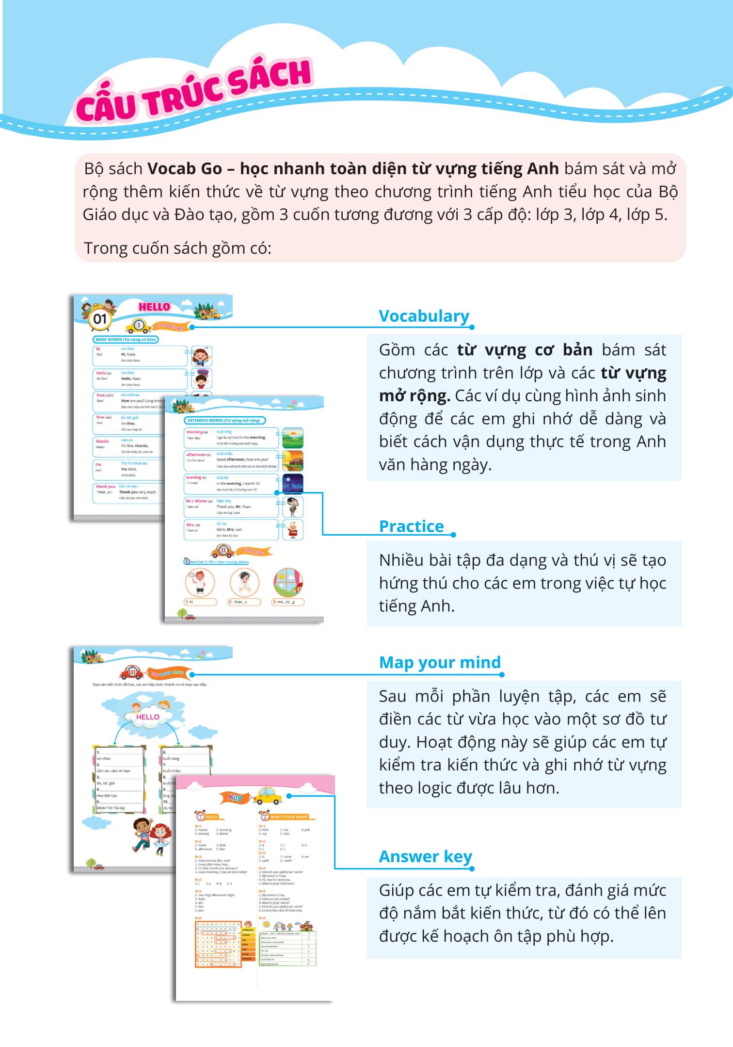 - Answer key – Đáp án chi tiết, giúp các con tự đánh giá – tự học dễ dàng Ngoài ra, nội dung sách được thiết kế bao trùm toàn bộ chương trình học trên lớp, giúp các em liên hệ và vận dụng kiến thức được học trên lớp vào việc tự học và ngược lại, ứng dụng kiến thức tự học để giải quyết dễ dàng bài tập trên lớp. Với những ưu điểm trên, Vocab Go – Học nhanh toàn diện từ vựng tiếng Anh chính là bộ sách “gối đầu giường” giúp học sinh Tiểu học nắm chắc từ vựng quan trọng và tạo nền tảng kiến thức tốt để tiếp tục học những kỹ năng khác, tự tin chinh phục tiếng Anh.