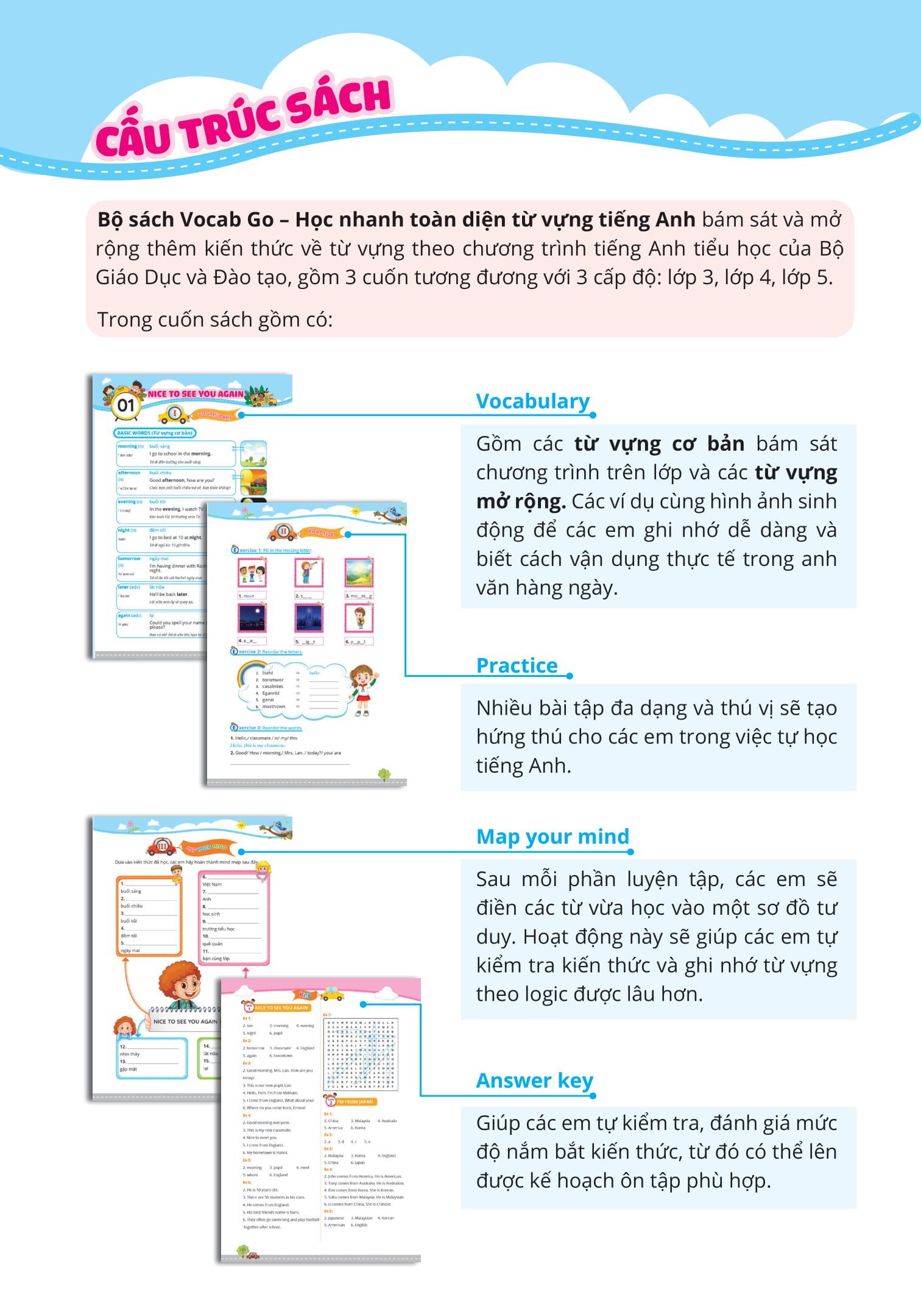Với những ưu điểm trên, Vocab Go – Học nhanh toàn diện từ vựng tiếng Anh chính là bộ sách “gối đầu giường” giúp học sinh Tiểu học nắm chắc từ vựng quan trọng và tạo nền tảng kiến thức tốt để tiếp tục học những kỹ năng khác, tự tin chinh phục tiếng Anh.