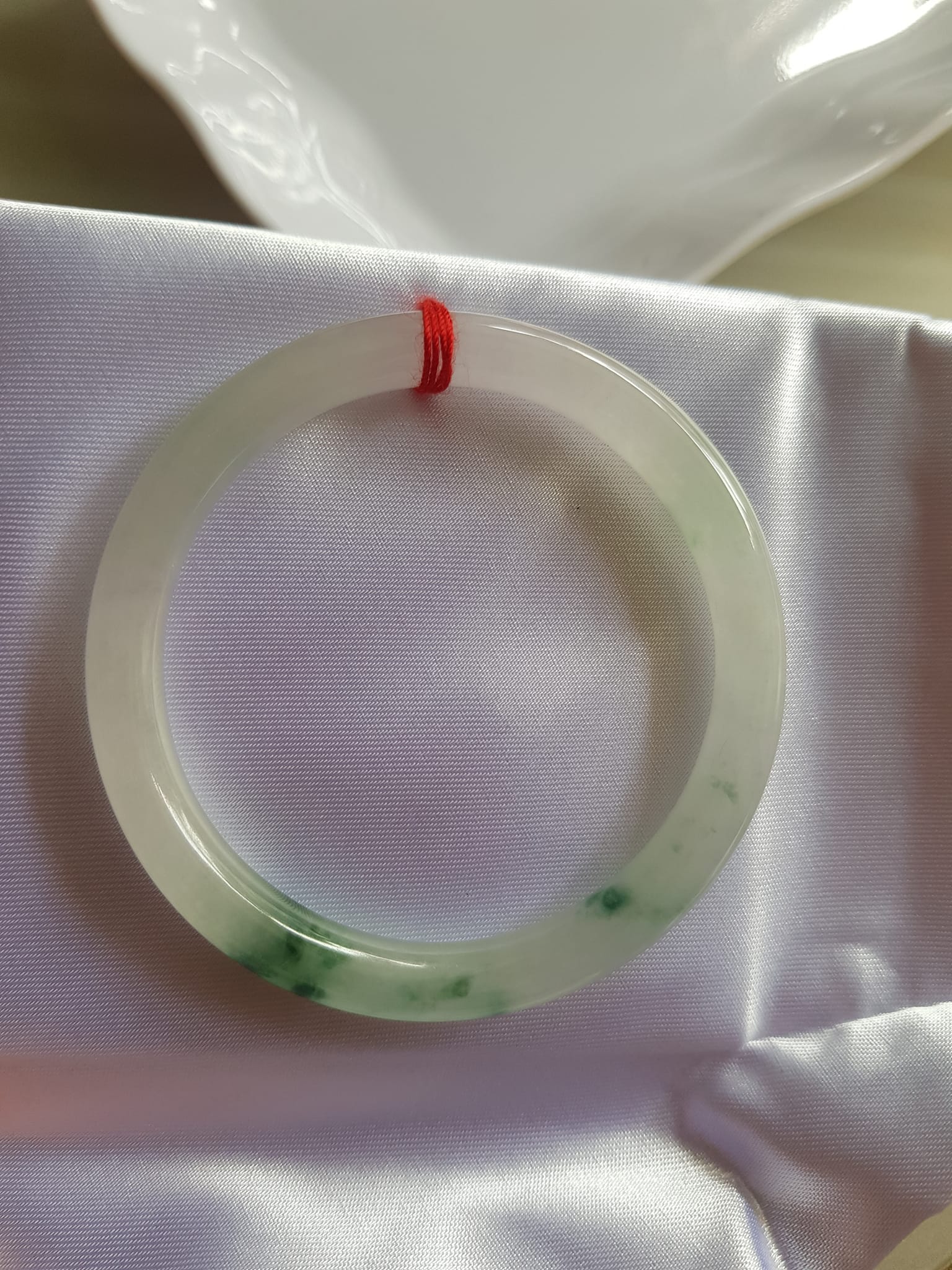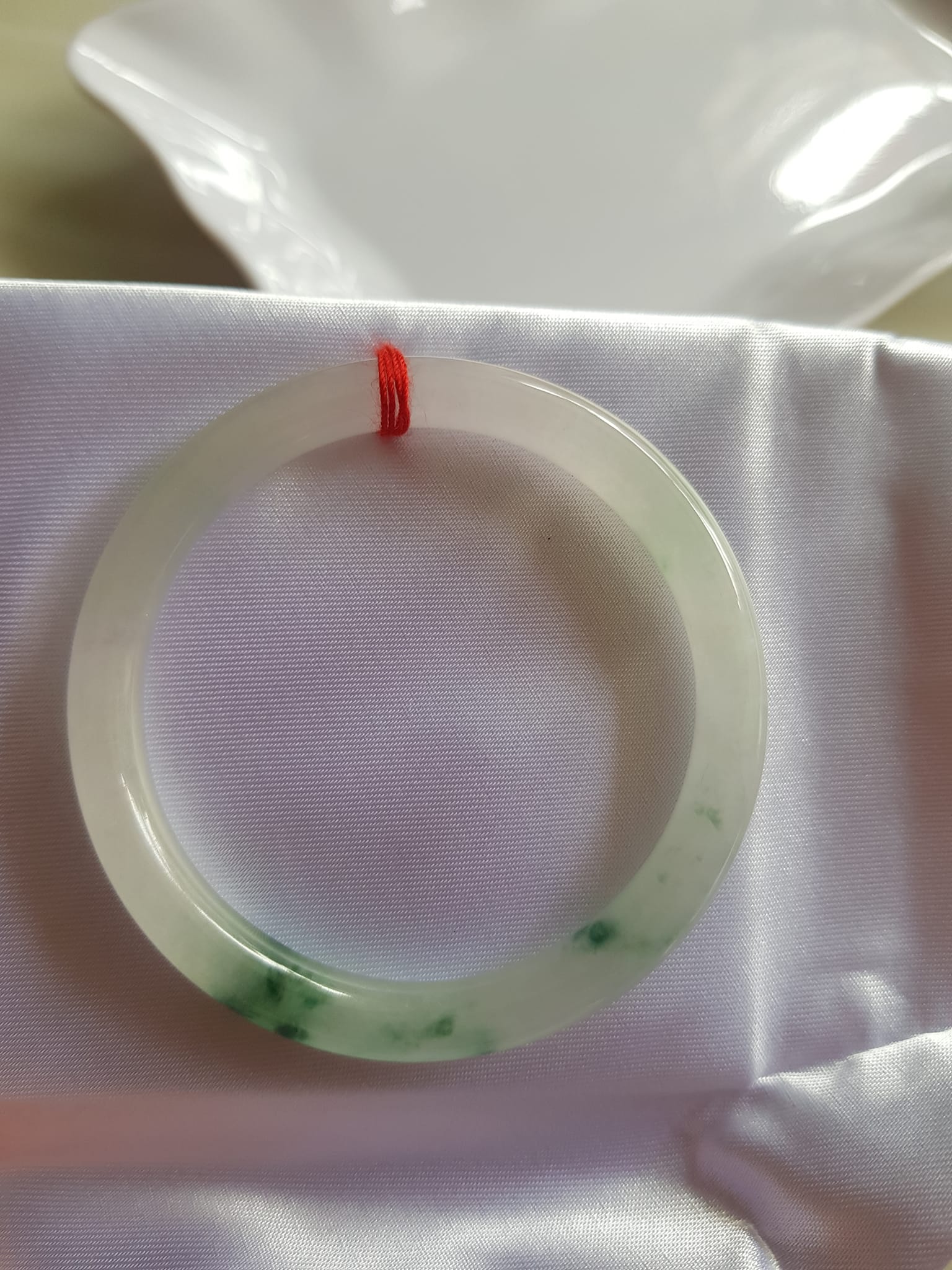Vòng đeo tay Nữ đá cẩm thạch tự nhiên Tím Lý 50mm x cọng nhỏ 6,2 mm màu trắng bóng 1 bên xanh lý đậm ánh tím nhẹ thiệt đẹp