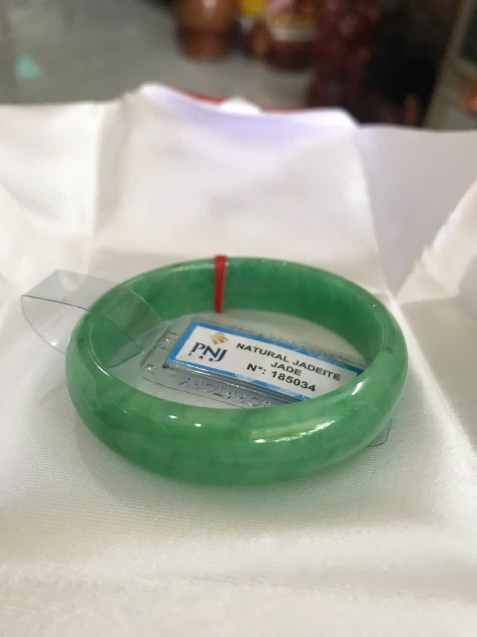 Vòng Tay Nữ Đá Ngọc Cẩm Thạch Tự Nhiên Bản Hẹ Sịn Đậu Lý Sao Ni 48mm Cao 12mm Dầy 6mm đã kiểm định kèm giấy chứng nhận P No 185034 Màu Xanh ngọc lý tươi bóng đều đẹp nữ tay nhỏ 35kg - 48kg ạ