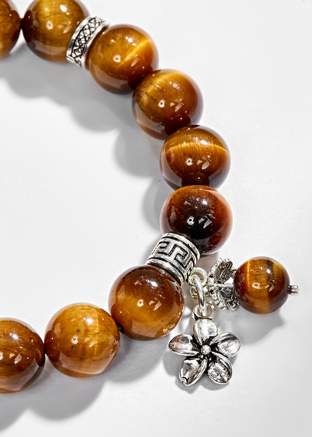 Vòng tay thạch anh mắt hổ vàng nâu phối hồ ly & hoa 5 cánh (10mm) mang lại sự tự tin, dũng khí và giúp cho con người quyết đoán hơn trong công việc, đem đến sự thành công.
