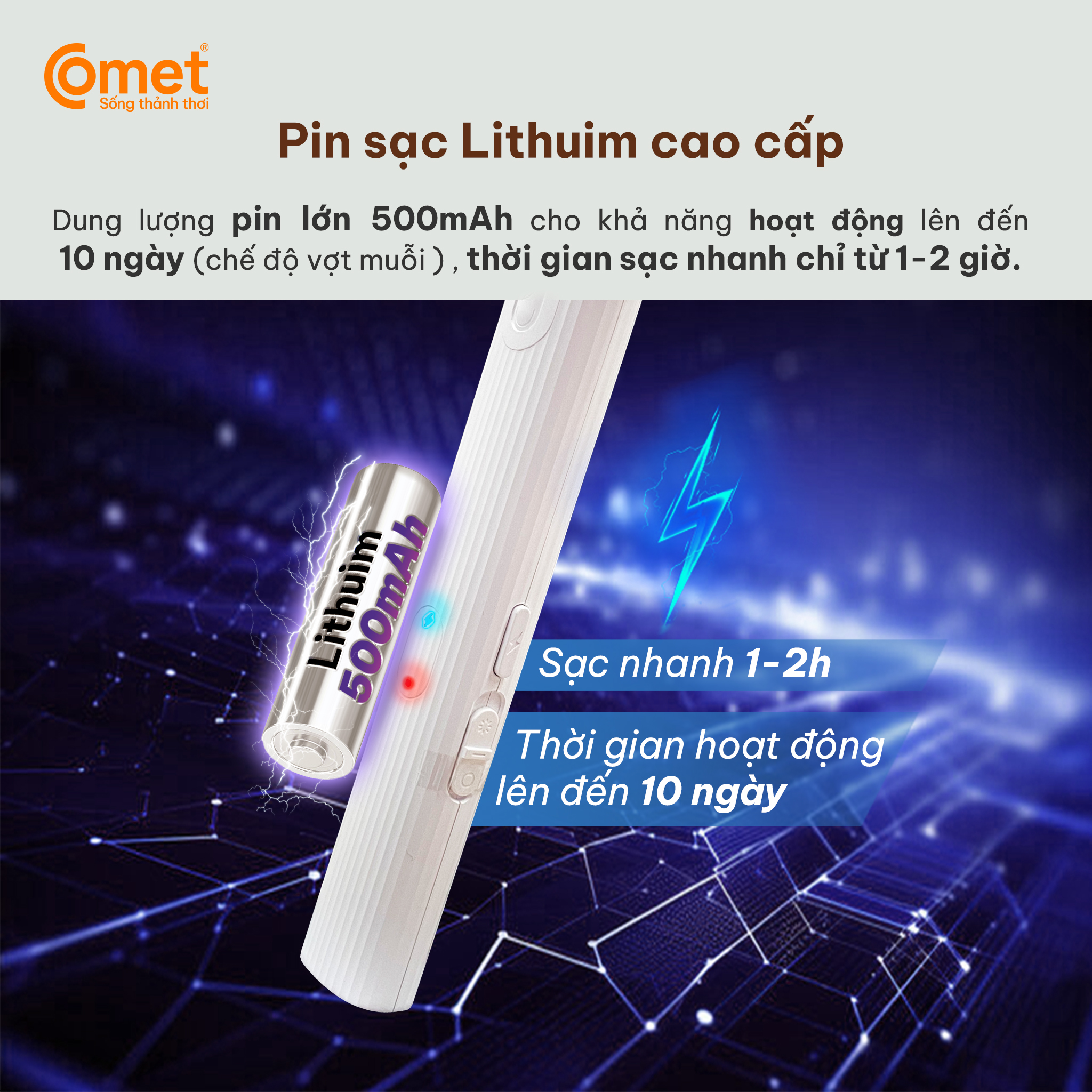 ✨Vợt muỗi điện Comet CP049 Pin Lithium 500mAh sạc 2h dùng 10 ngày BH 12T cổng sạc type C