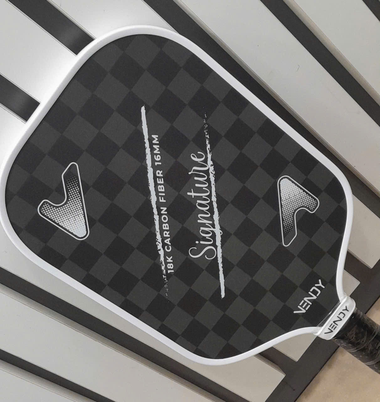 VỢT PICKLEBALL VENDY SIGNATURE Vợt được thiết kế đẹp mắt với gam màu đen - xám xen kẽ, phối viền trắng, sự đơn giản tạo nên cao cấp cho chiếc vợt. Bề mặt vợt là carbon