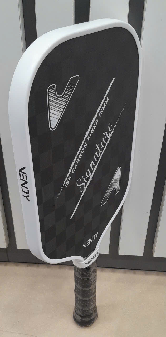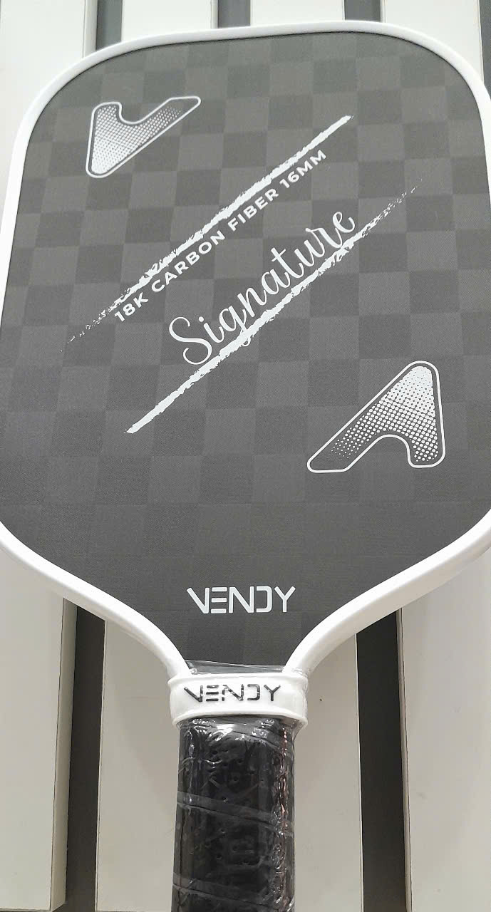 VỢT PICKLEBALL VENDY SIGNATUREVợt được thiết kế đẹp mắt với gam màu đen - xám xen kẽ, phối viền trắng, sự đơn giản tạo nên cao cấp cho chiếc vợt.Bề mặt vợt là carbon 18k có độ nhám cao, cùng các ho...