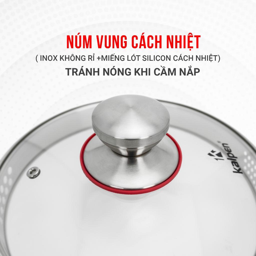 Núm vung cách nhiệt: Núm vung được làm từ Inox không rỉ cao cấp kết hợp với miếng lót silicon cách nhiệt, giúp người sử dụng không bị nóng khi cầm nắp, một đặc điểm mà không phải nắp kính nào cũng có.