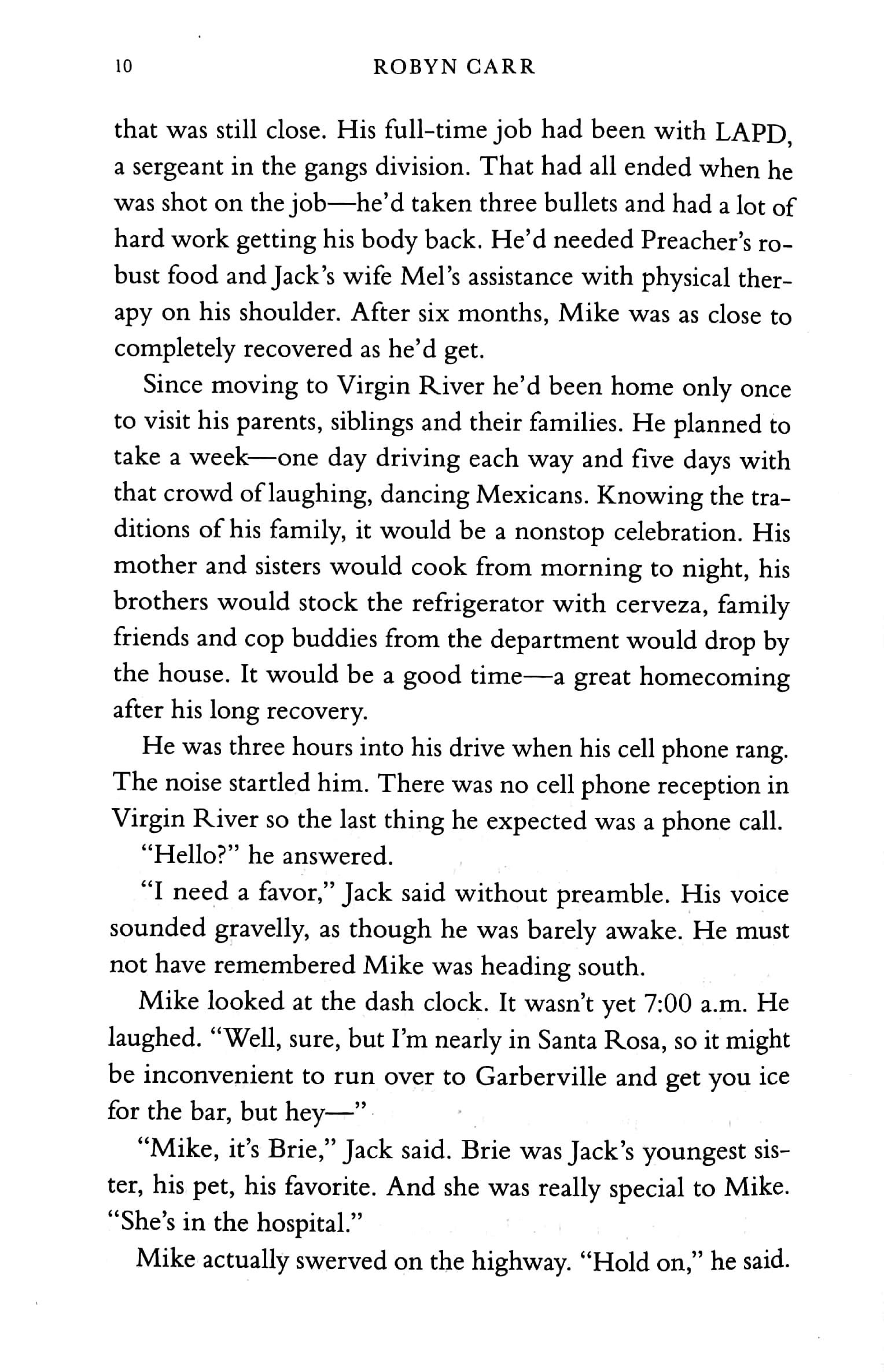 LAPD officer Mike Valenzuela was badly wounded in the line of duty. When he agrees to become Virgin River's first cop, he does so knowing it's time he settled down. Twice divorced and the lover of too many women, he secretly longs for the kind of commitment and happiness his marine buddies have found—a woman who can tie up his heart forever.