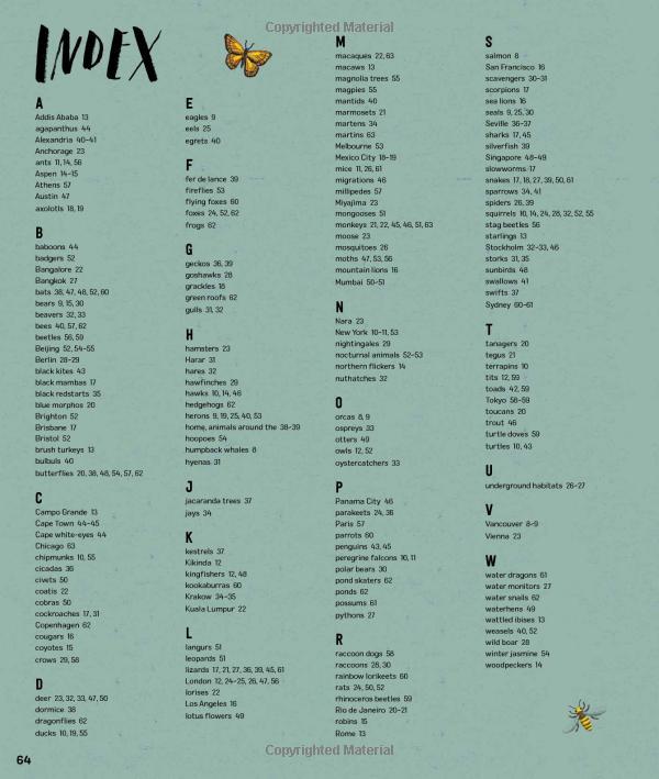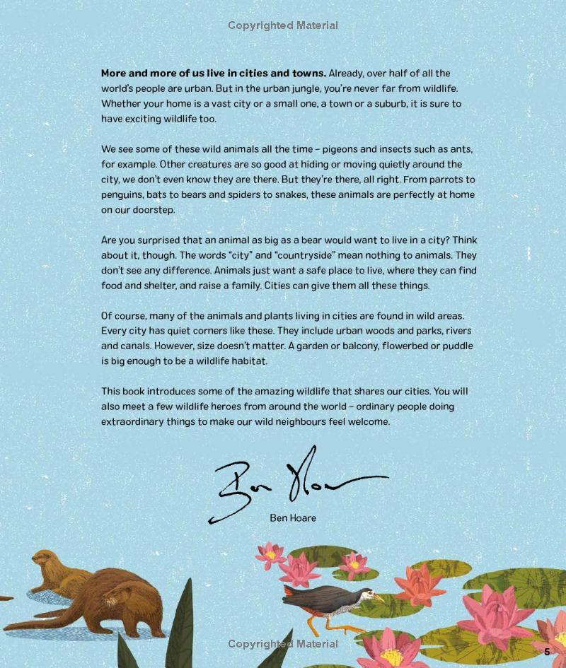 Wild City travels the globe, exploring how animals have adapted to live alongside humans, in busy cities including New York, Rio de Janeiro, Berlin, Stockholm, London, Alexandria, Singapore, and Mumbai. Discover hawks by a world-famous shopping street, snakes slithering through city sewers, and penguins waiting patiently to cross the road. Feature spreads take a closer look at the animals, showing how some wander in plain sight while others hide away in our homes, and we meet wildlife heroes from around the world--ordinary people doing extraordinary things to make our wild neighbors feel welcome.