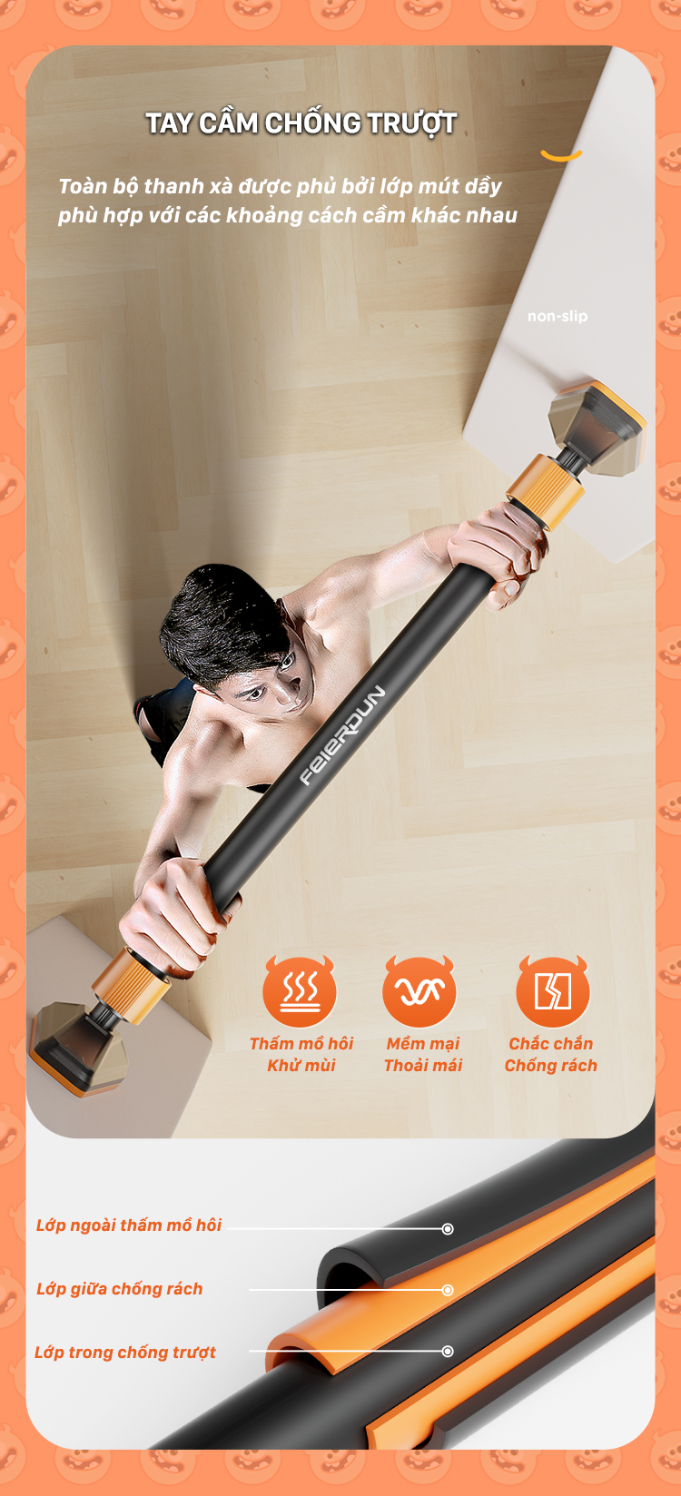 Tên Sản Phẩm XÀ ĐƠN GẮN CỬA FED Mã SP FED-0228 Màu Sắc Đen Cam Kích Thước 90cm - 115cm (Tùy chỉnh độ dài của xà theo kích thước cửa) Chất Liệu Thép carbon, PVC,