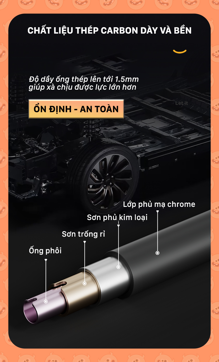- Chất liệu ống: Thép carbon 5 lớp dày 1.5mm