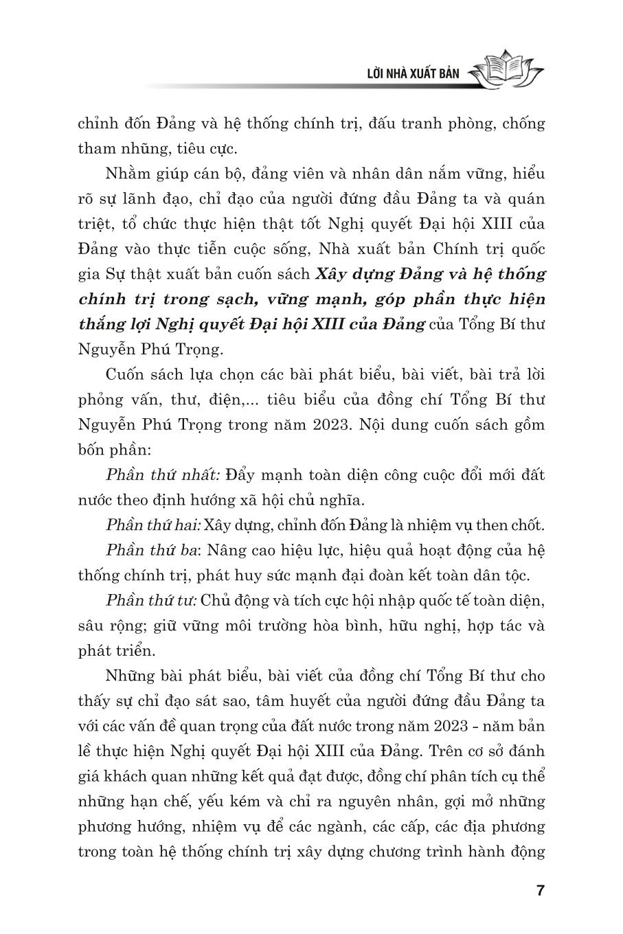 Mua tại TiktokCuốn sách “Xây dựng Đảng và hệ thống chính trị trong sạch, vững mạnh, góp phần thực hiện thắng lợi Nghị quyết Đại hội XIII của Đảng” tuyển chọn các bài phát biểu, bài viết, bài trả lời phỏng vấn, thư, điệ tiêu biểu của đồng chí Tổng Bí thư Nguyễn Phú Trọng trong năm 2023, cho thấy sự chỉ đạo sát sao, tâm huyết của người đứng đầu Đảng ta với các vấn đề quan trọng của đất nước trong năm 2023 - năm bản lề thực hiện Nghị quyết Đại hội XIII của Đảng.