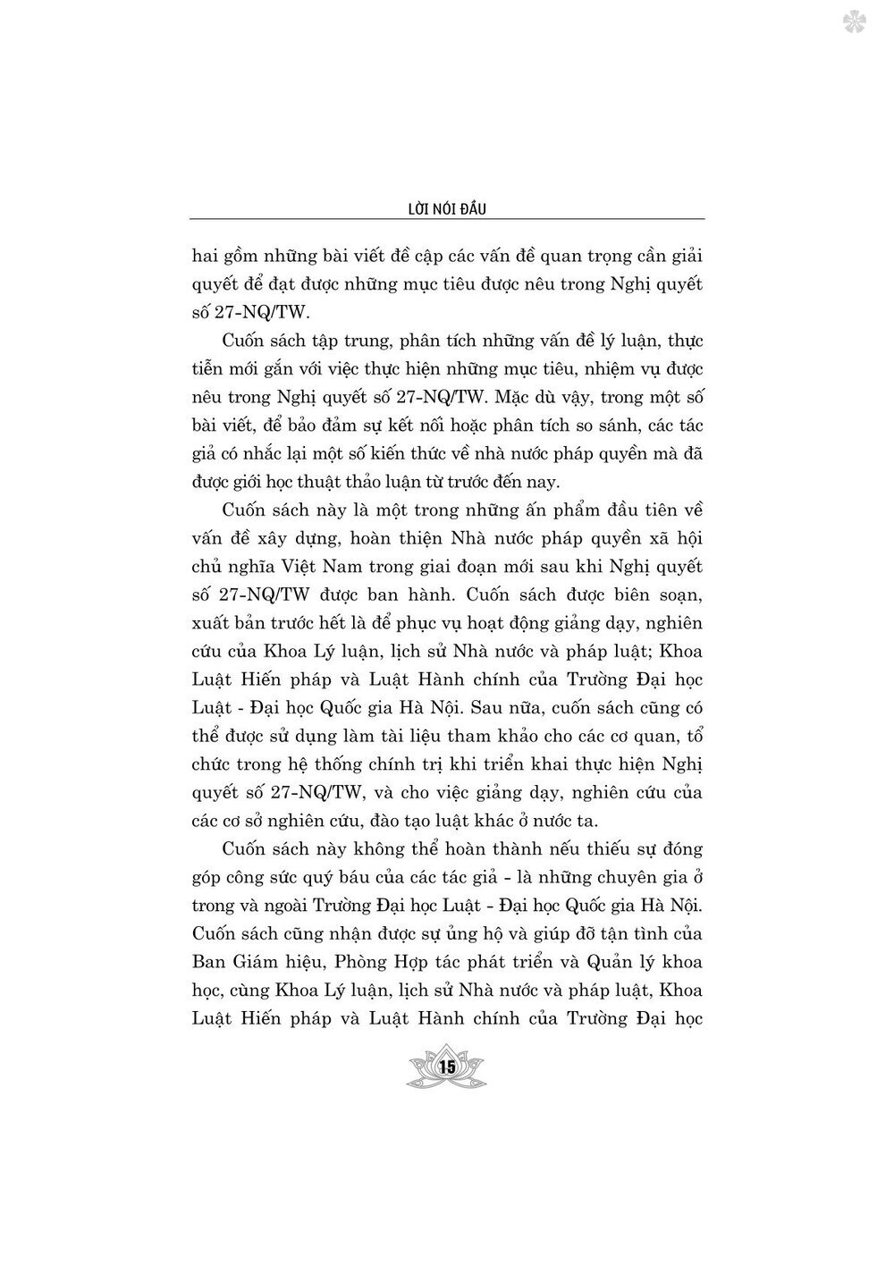Nhằm giúp cho bạn đọc có tài liệu nghiên cứu, tham khảo, Nhà xuất bản Chính trị quốc gia Sự thật xuất bản cuốn sách Xây dựng, hoàn thiện Nhà nước pháp quyền xã hội chủ nghĩa Việt Nam: Giai đoạn mới, yêu cầu mới trong đó tập hợp các bài viết nghiên cứu một cách có hệ thống, phân tích cơ sở lý luận, thực tiễn của việc xây dựng, hoàn thiện Nhà nước pháp quyền xã hội chủ nghĩa Việt Nam trong giai đoạn mới theo tinh thần Nghị quyết số 27-NQ/TW.