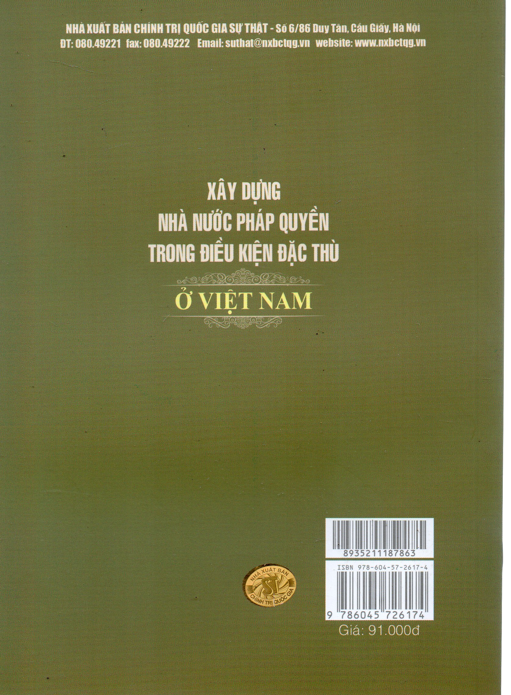 Mua tại TiktokCuốn sách tiếp cận vấn đề xây dựng Nhà nước pháp quyền xã hội chủ nghĩa theo hướng mới: phân tích việc xây dựng Nhà nước pháp quyền xã hội chủ nghĩa Việt Nam trong điều kiện đặc thù trong nước và thời đại, đề xuất những giải pháp chủ yếu xây dựng Nhà nước pháp quyền xã hội chủ nghĩa Việt Nam phù hợp với những điều kiện của Việt Nam. Nội dung cuốn sách gồm 04 chương: Chương I: Những tiền đề lý luận xây dựng nhà nước pháp quyền xã hội chủ nghĩa ở Việt Nam; Chương II: Nhà nước pháp quyền và nhà nước quyền xã hội chủ nghĩa Việt Nam; Chương III: Xây dựng nhà nước pháp quyền xã hội chủ nghĩa Việt Nam trong điều kiện đặc thù; Chương IV: Những giải pháp chủ yếu xây dựng nhà nước pháp quyền xã hội chủ nghĩa Việt Nam.