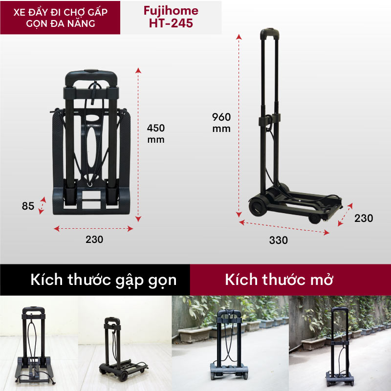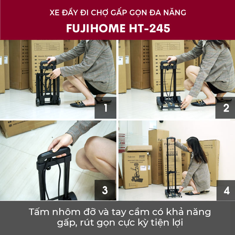 Xe đẩy đi chợ gấp gọn mini đa năng FUJIHOME HT-245 Sử dụng chất liệu mặt nhựa và tay nắm bằng thép sơn tĩnh điện khi thiết kế nên có ưu điểm rất nhẹ. Tay cầm dạng vuông có thể rút gọn mang lại sự chắc chắn, tiện lợi khi sử dụng, di chuyển cũng như khi cất giữ, bảo quản. Sàn để đồ bằng nhựa PP bảo vệ môi trường, loại nhựa sạch, có khả năng tái chế này không bị giảm chất lượng cho dù phải tiếp xúc nhiều với hoá chất và chống chịu tốt với thời tiết mưa hay môi trường ẩm ướt.   Công dụng: Xe đẩy đi chợ gấp gọn đa năng FUJIHOME HT-245: Đối tượng phù hợp nhất có lẽ là những người mẹ đã lớn tuổi của mình. Vì lúc này mỗi lần đi chợ mà phải tay xách túi này túi kia thì quả thực là một cực hình với các mẹ các bà. Không những thế nó còn ảnh hưởng đến vấn đề xương khớp nữa.   Xe thiết kế có dây buộc chắc chắn   Đối tượng thứ 2 mà mình nhắc tới nữa là những người có cộng việc rất bận rộn, thường chỉ có thể đi chợ vào những ngày nghỉ cuối tuần. Vì vậy mỗi lần mua thường sẽ rất nhiều thực phẩm, có lẽ các bạn nên sắm cho mình một chiếc xe kéo đi chợ để công việc đó trở nên nhẹ nhàng vui vẻ hơn rất nhiều.     Ưu điểm: - Xe đẩy đi chợ gấp gọn đa năng FUJIHOME HT-245 được làm từ chất liệu nhựa nên rất nhẹ nhàng, siêu gọn. Trọng lượng nhẹ chỉ 1,3kg và có thể gấp gọn lại khi không sử dụng nên rất tiện lợi. Tải trọng của xe lên tới 45kg giúp bạn thoải mái mua sắm.