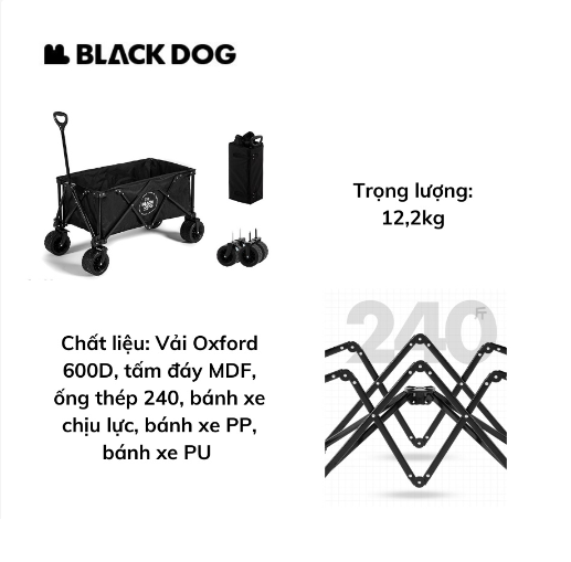 THÔNG TIN SẢN PHẨM: 1. Xe kéo - Thương hiệu: Blackdog - Tên sản phẩm: Xe kéo gấp gọn tháo rời bánh - Mã sản phẩm: BD-TC002 - Chất liệu: Vải Oxford 600D, tấm đáy MDF, ống thép, bánh xe chịu lực, bánh xe PP, bánh xe PU - Kích thước sử dụng: 905055/107cm - Kích thước gập gọn: 2022.56.5cm (tháo bánh) - Dung tích: 120L - Trọng lượng: 12,2kg - Chịu lực tải 150kg - Màu sắc: Đen, Be - Xuất xứ: Trung Quốc 2. Mặt bàn xe kéo Thương hiệu: Blackdog Tên sản phẩm: Mặt bàn cho xe kéo gấp gọn Mã sản phẩm: BD-ZZ003B Chất liệu: Hợp kim nhôm Kích thước sử dụng: 90605.5cm Kích thước gập gọn: 61*10.5cm (tháo bánh) Trọng lượng: 2.8kg Tải trọng: 30kg Màu sắc: Đen Xuất xứ: Trung Quốc