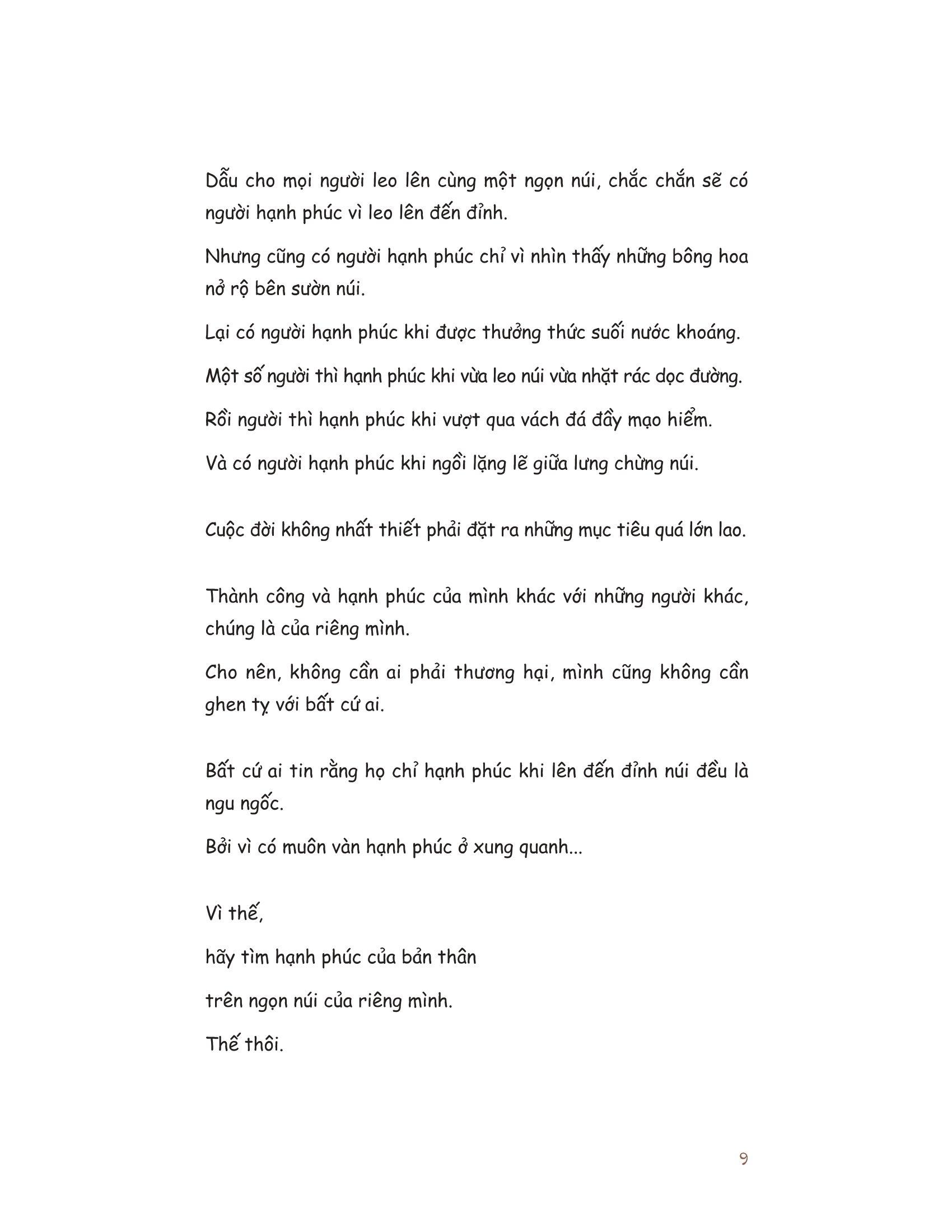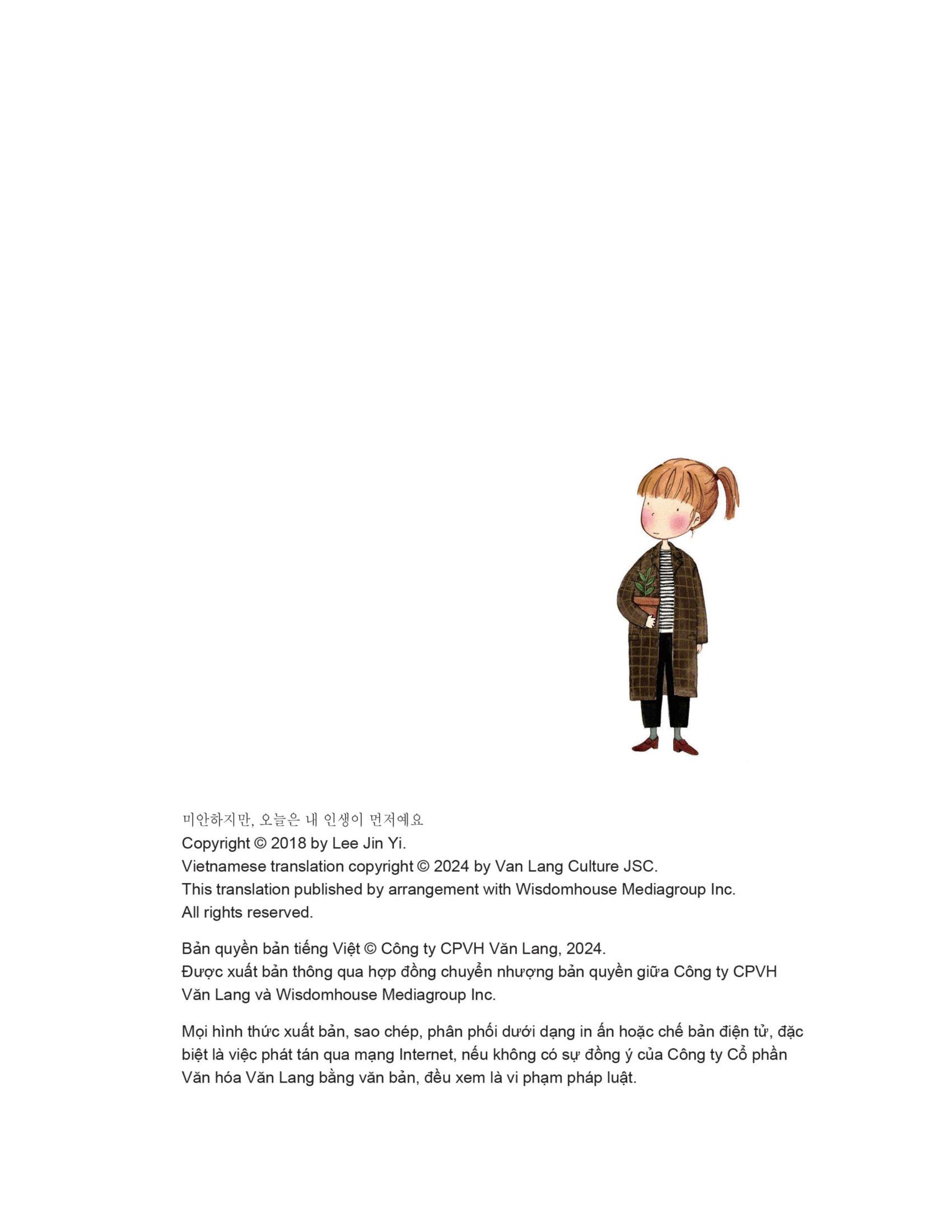 Xin Lỗi, Hôm Nay Cuộc Đời Tôi Là Trên Hết! Dù xinh đẹp hay xấu xí, bất kể tôi là người như thế nào, thì trước tiên, tôi phải chấp nhận và yêu thương bản thân m.ình. Tôi là một người rất nhạy cảm. Đôi khi nhạy cảm đến mức tự làm khó chính m.ình. Càng cố gắng quan tâm, tôi càng trở nên mệt mỏi, các mối quan hệ càng thu hẹp, và tôi không thể làm hai việc cùng một lúc. Nếu lãng phí cuộc đời để trở thành một người xuất sắc, tuyệt vời và xinh đẹp, thì đó chẳng phải là một việc rất đáng buồn sao? Tôi chỉ cần sống một cuộc đời là chính tôi thôi. Vì thế, tôi quyết định yêu bản thân m.ình. Tôi quyết định bắt đầu từ điều đó.