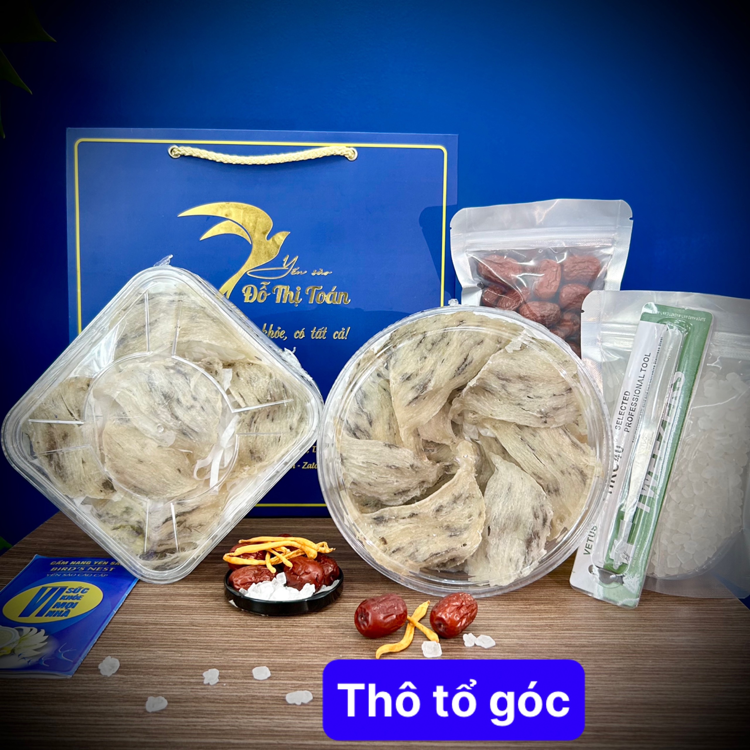 Quà tặng đi kèm cùng yến: Đường phèn, táo đỏ, nhíp nhặt lông và túi giấy Yến sào cao cấp Đỗ Thị Toán