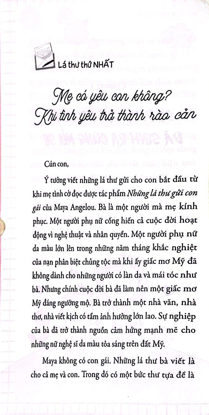 Cuốn sách gồm 20 bức thư mẹ gửi cho con gái, là những câu chuyện về trăn trở, nỗ lực vượt qua sợ hãi để đi tìm sự cân bằng và niềm tin vào chính bản thân m.ình của một người phụ nữ bình thường vốn mang nhiều âu lo, sợ hãi trong cuộc đời, từ đó truyền cho con những bài học cuộc sống. Bằng cách gọi tên các nỗi sợ: Sợ m.ình không được đủ yêu thương, Sợ xa người bạn học cùng, Sợ vì m.ình quá nhút nhát, Sợ người khác không hiểu m.ình, Sợ khi người thân qua đời, Sợ khi m.ình không được như kỳ vọng… - Đó có thể là nỗi sợ hiển hiện trước mắt, cụ thể thường nhật hay những nỗi sợ vô hình, những nỗi sợ từ sự tưởng tượng, người viết nhìn lại bản thân m.ình, trò chuyện cùng con, giúp con gọi tên những nỗi sợ đó và tìm cách vượt qua nó. Không né tránh nỗi sợ, cũng không giáo điều thuyết giảng, nội dung bản thảo là những lá thư nhẹ nhàng mà người mẹ muốn con gái cùng m.ình lắng nghe và khám phá nội tâm của m.ình.