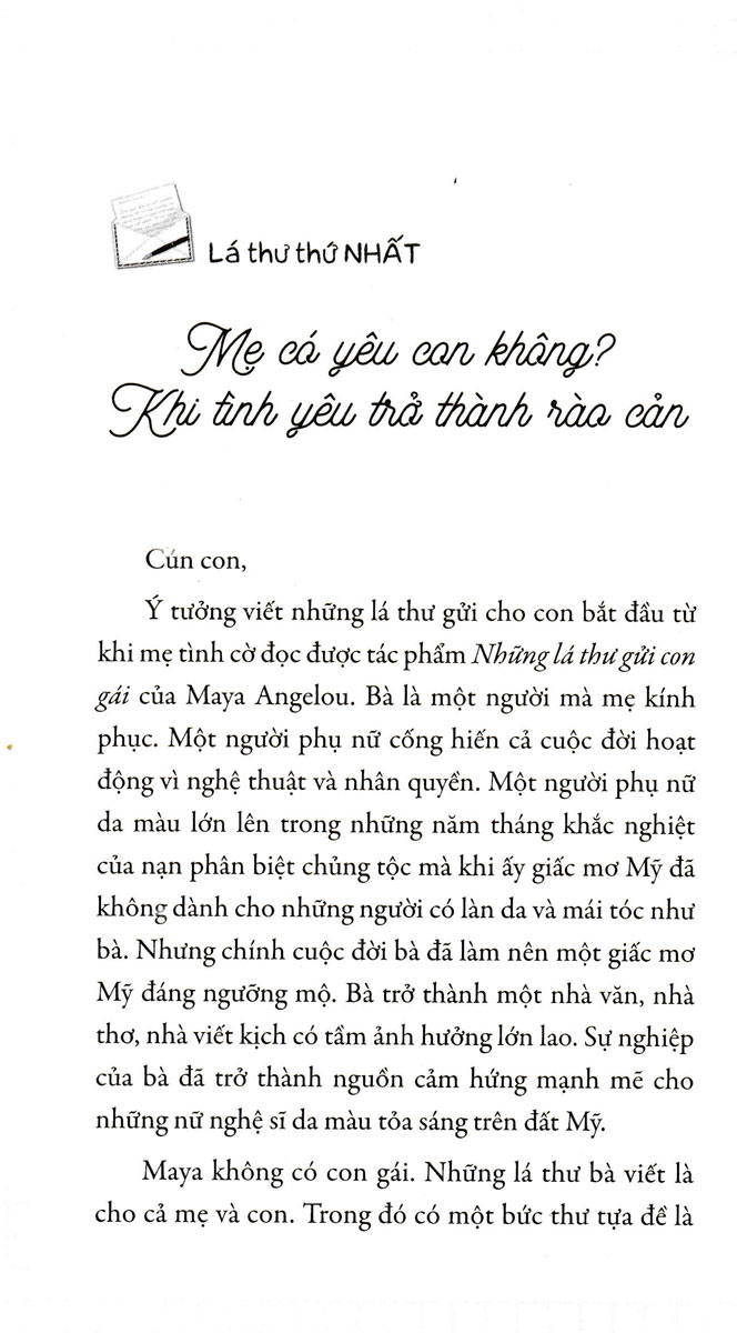 Cuốn sách gồm 20 bức thư mẹ gửi cho con gái, là những câu chuyện về trăn trở, nỗ lực vượt qua sợ hãi để đi tìm sự cân bằng và niềm tin vào chính bản thân mình của một người phụ nữ bình thường vốn mang nhiều âu lo, sợ hãi trong cuộc đời, từ đó truyền cho con những bài học cuộc sống. Bằng cách gọi tên các nỗi sợ: Sợ mình không được đủ yêu thương, Sợ xa người bạn học cùng, Sợ vì mình quá nhút nhát, Sợ người khác không hiểu mình, Sợ khi người thân qua đời, Sợ khi mình không được như kỳ vọng… - Đó có thể là nỗi sợ hiển hiện trước mắt, cụ thể thường nhật hay những nỗi sợ vô hình, những nỗi sợ từ sự tưởng tượng, người viết nhìn lại bản thân mình, trò chuyện cùng con, giúp con gọi tên những nỗi sợ đó và tìm cách vượt qua nó. Không né tránh nỗi sợ, cũng không giáo điều thuyết giảng, nội dung bản thảo là những lá thư nhẹ nhàng mà người mẹ muốn con gái cùng mình lắng nghe và khám phá nội tâm của mình.